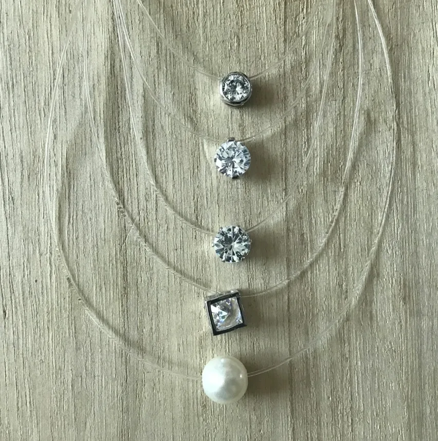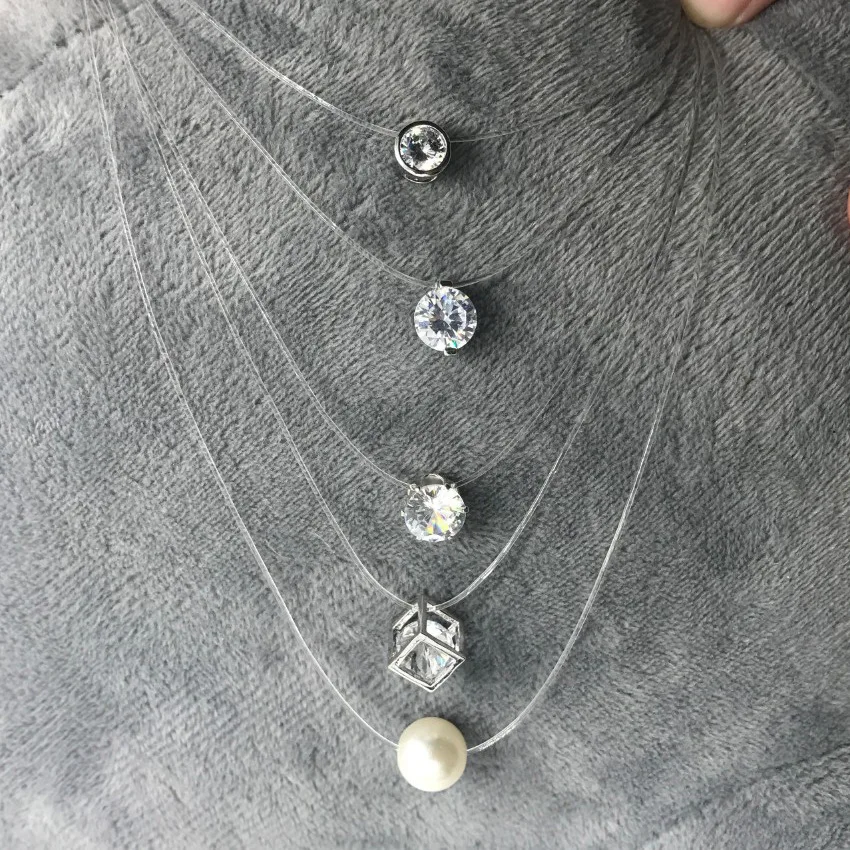 Fashion Square Imitation Pearl Cz Stone Crystal Zircon Necklace Invisible Transparent Fishing Line Chain Necklace For Women