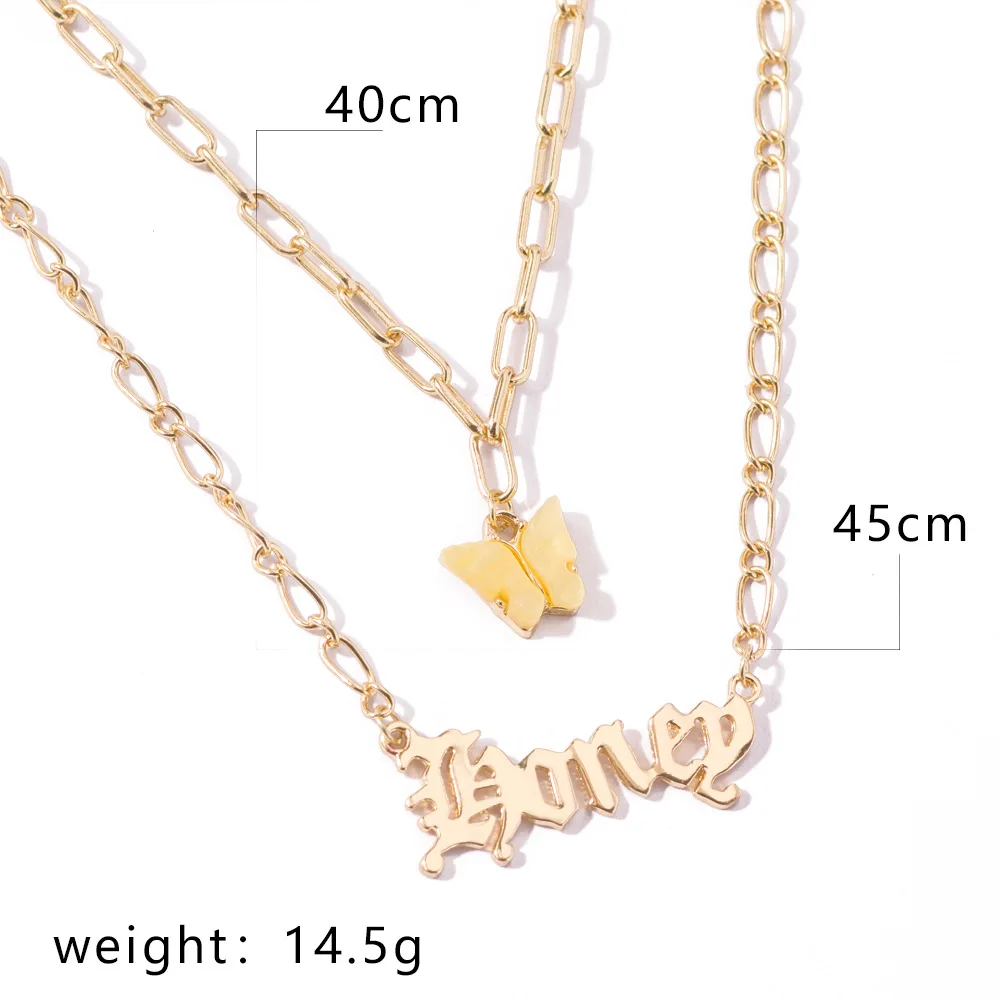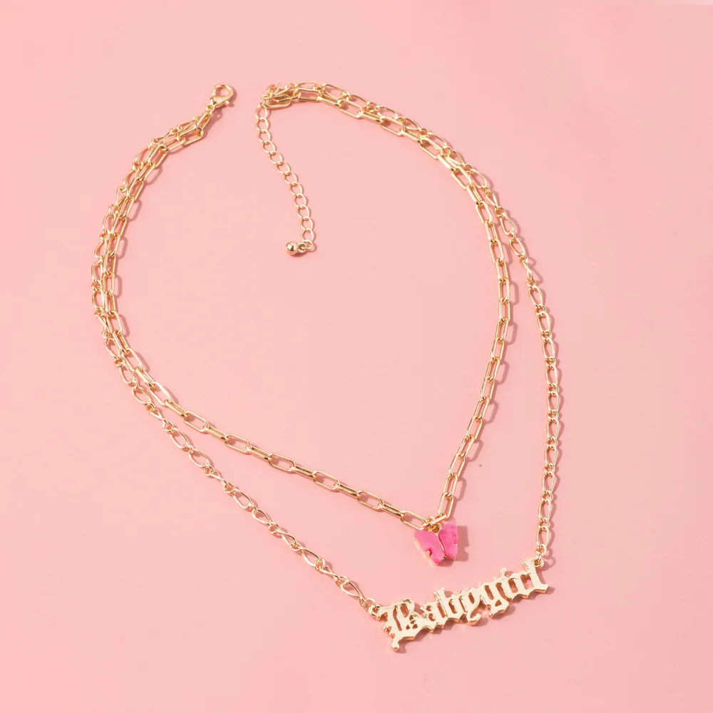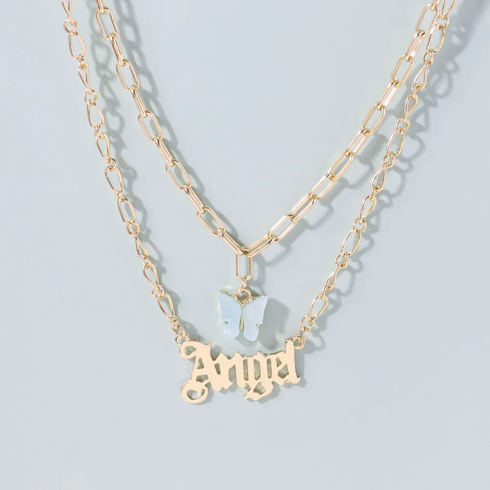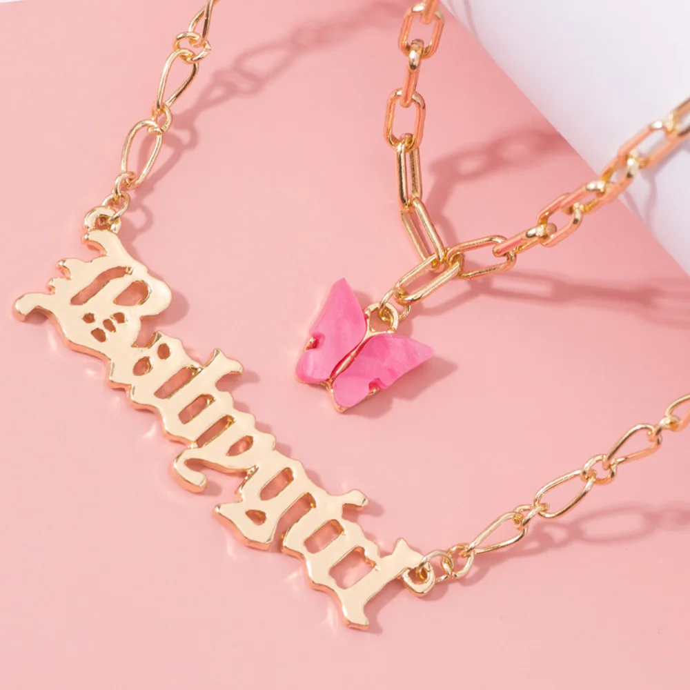 Fashion Acrylic Butterfly Old English Font Pendants Necklace Double Layer Acetic Acid Babygirl Necklace Choker Statement Jewelry