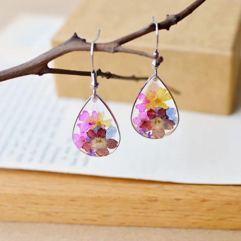 2017 New Hand Made Glass Frame Water Drop Shape Anti-allergy Real Colordul Dried Flowers Stud Earrings For Women Girls Wedding