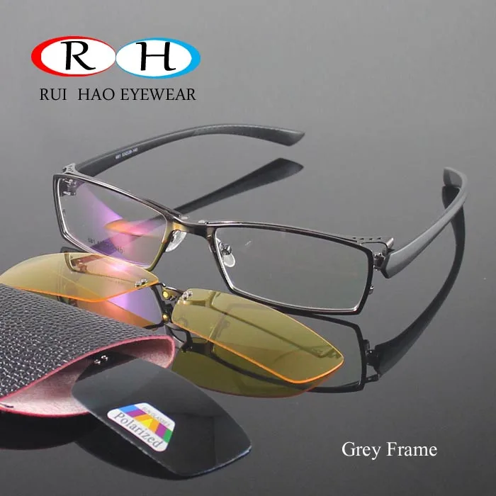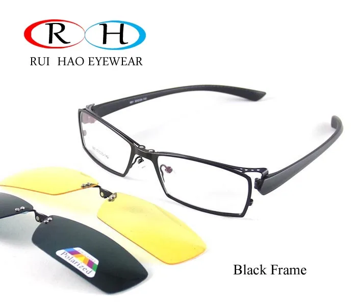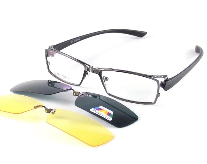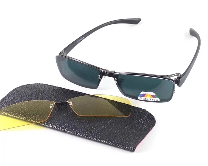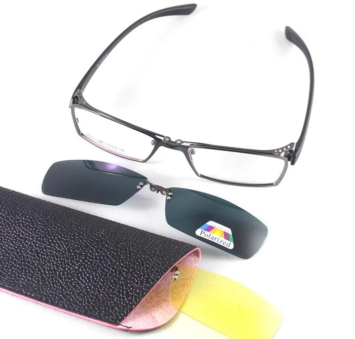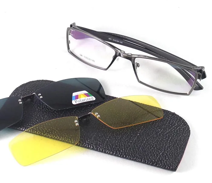 1 Eyeglasses frame, 1 deep green sunglasses clip-on, 1 yellow sunglasses clip-on, 1 soft bag.