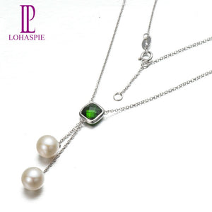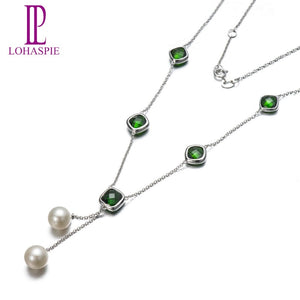 Lohaspie Solid 18K White Gold Natural Gemstone Chrome Diopside & Fresh Water Pearl Necklaces Pearl Jewelry For Mother's Gift