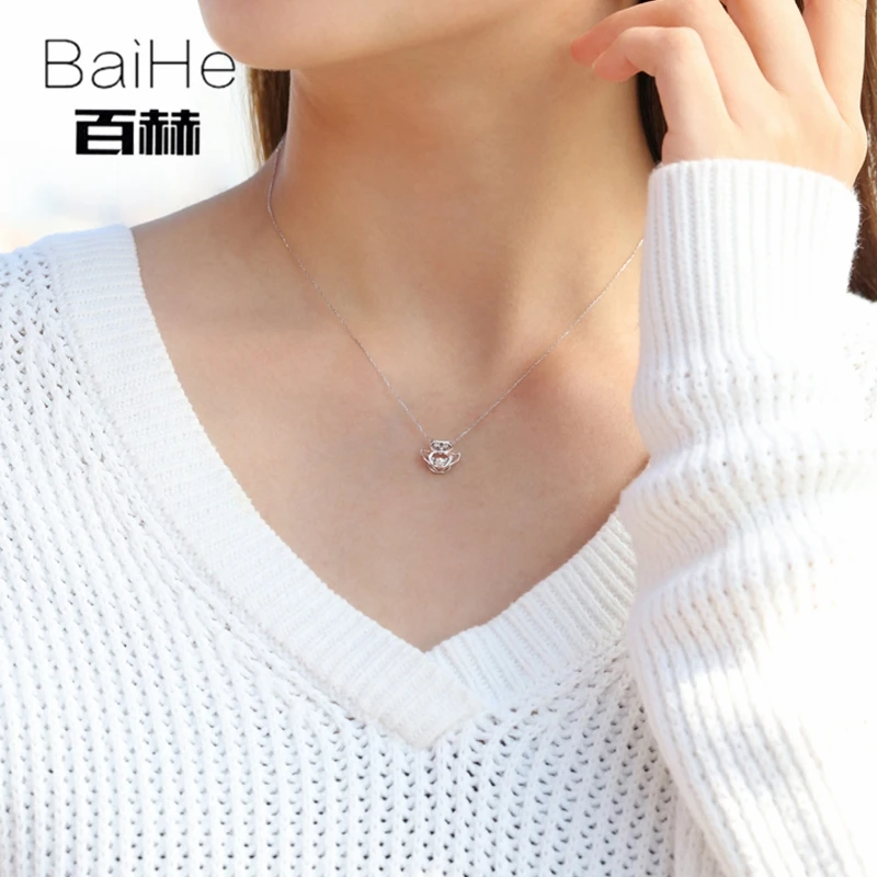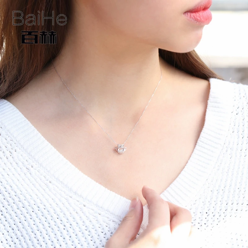 BAIHE Solid 14K White Gold 0.08CT Certified H/SI Round 100% Genuine Natural Diamonds Women Trendy Fine Jewelry Elegant Necklaces
