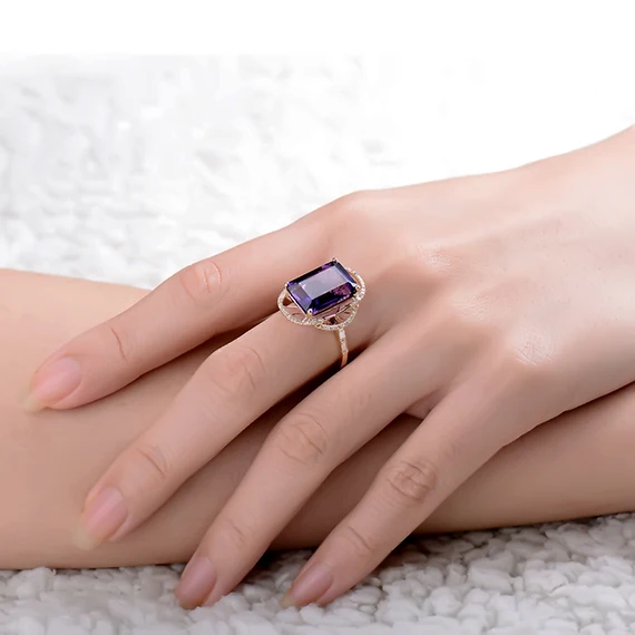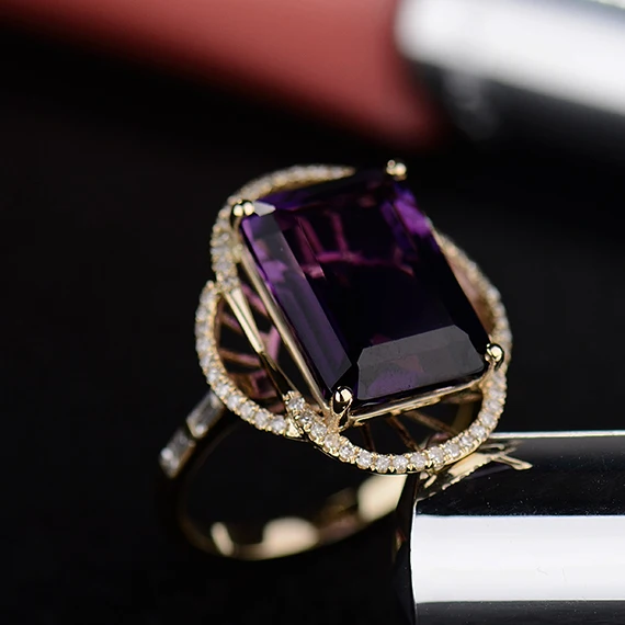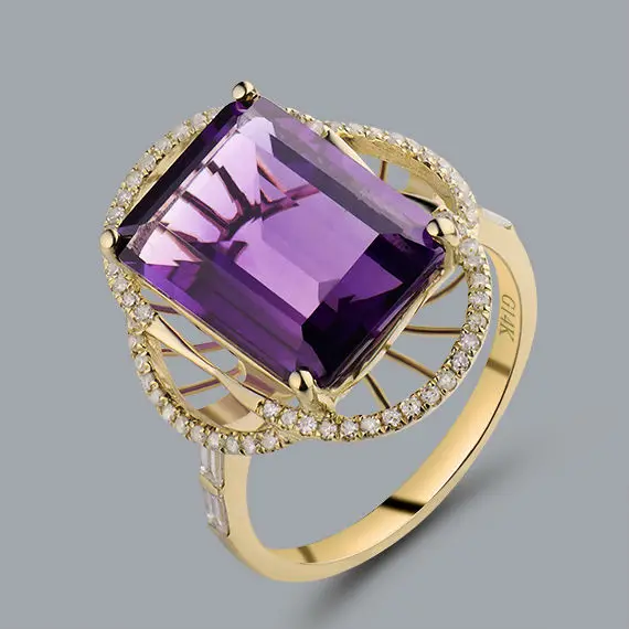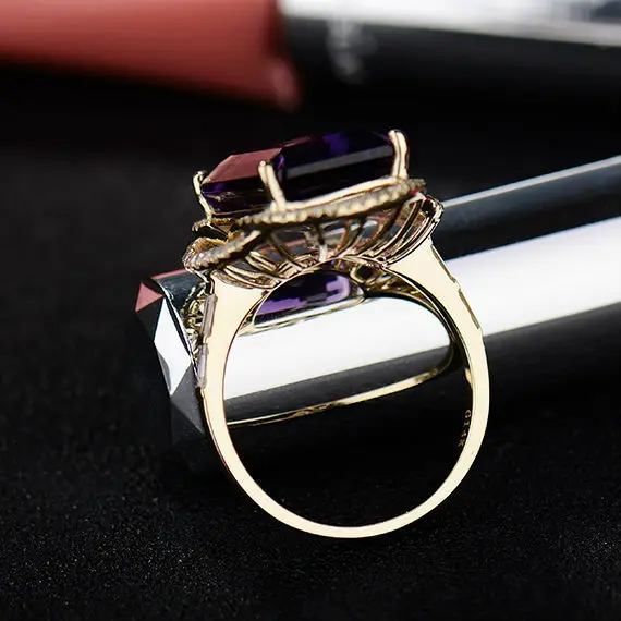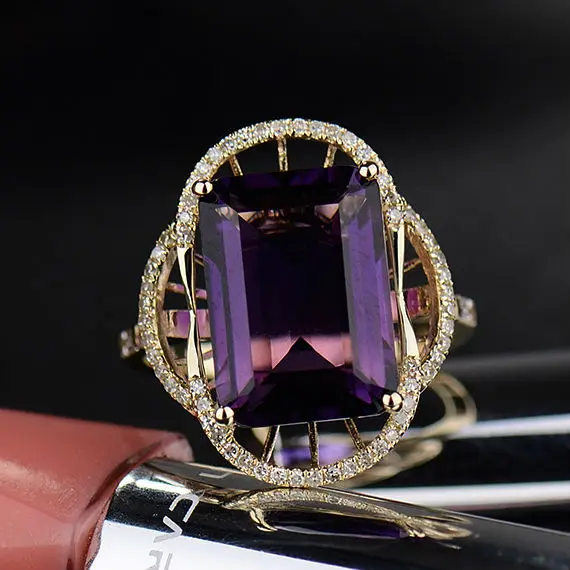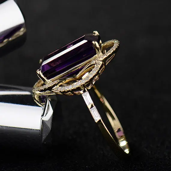Natural Amethyst Ring Emerald Cut 10x14mm Solid 14Kt Yellow Gold Baguette Diamond Purple Amethyst Engagement Rings For Sale
