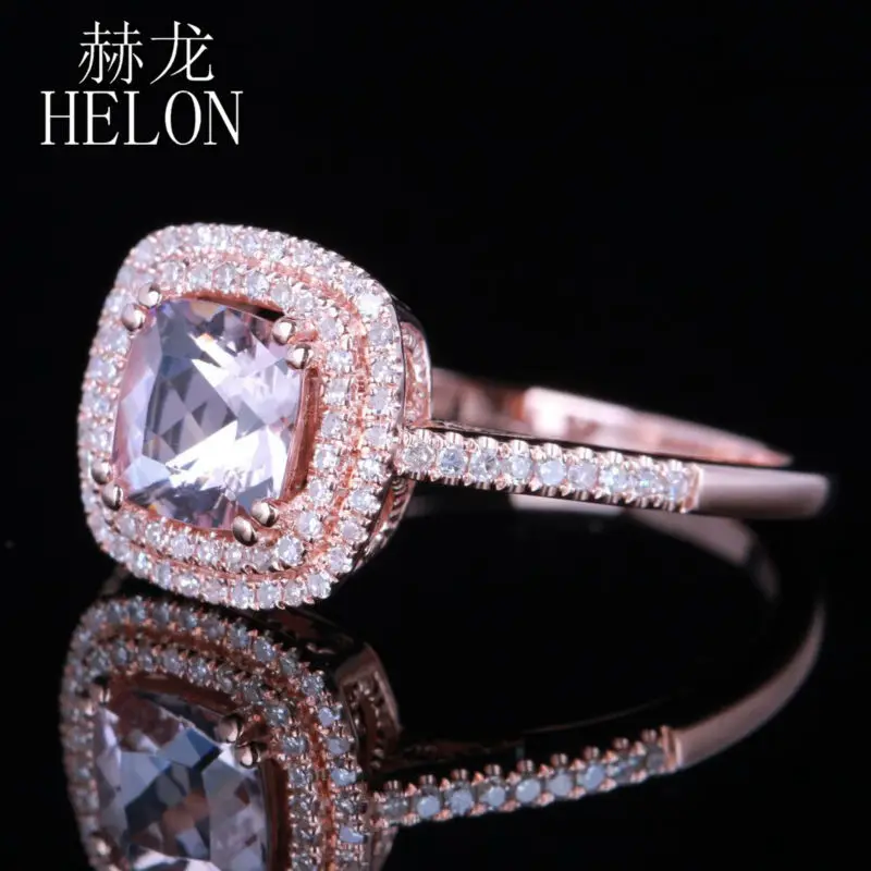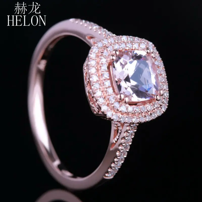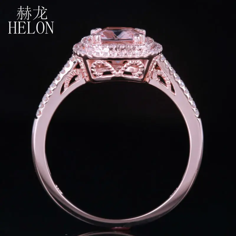 Hot Sell Jewelry 6mm Cushion 0.85CT Pink Morganite Pave 0.3ct Diamond Haloes Solid 14K Rose Gold Engagement Wedding Ring