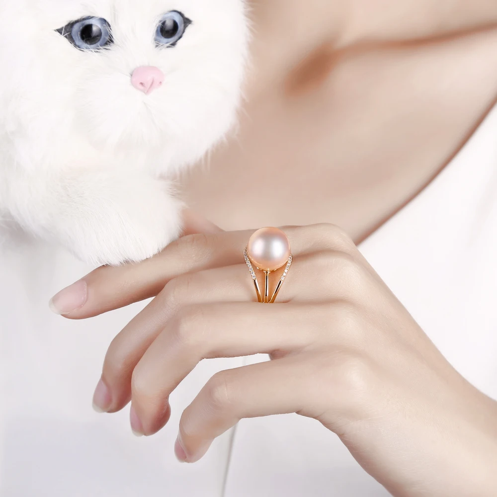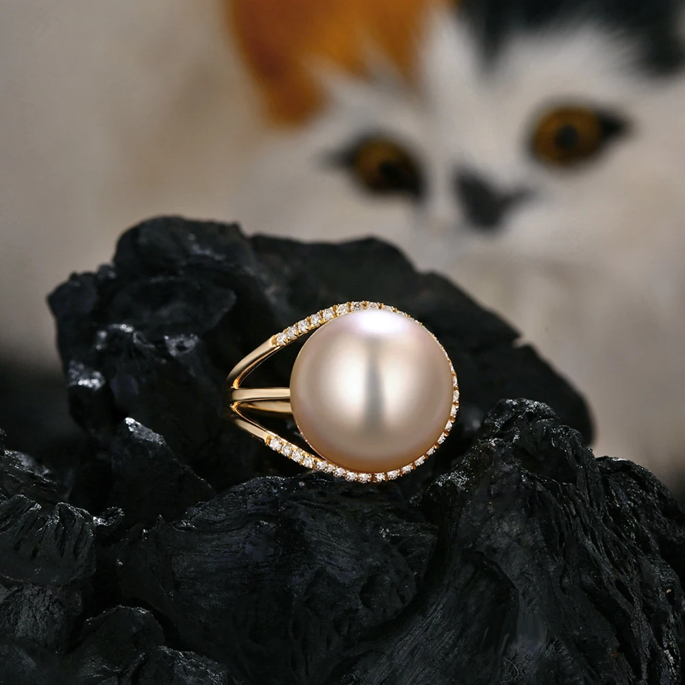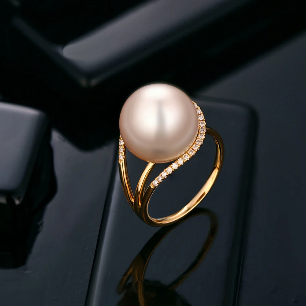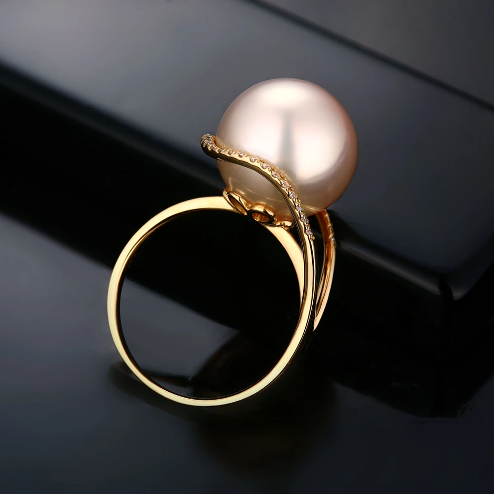 New collection 18k Yellow Gold precious 12-13mm Round Pearl Ring 0.18ct Natural Diamond manufacturer