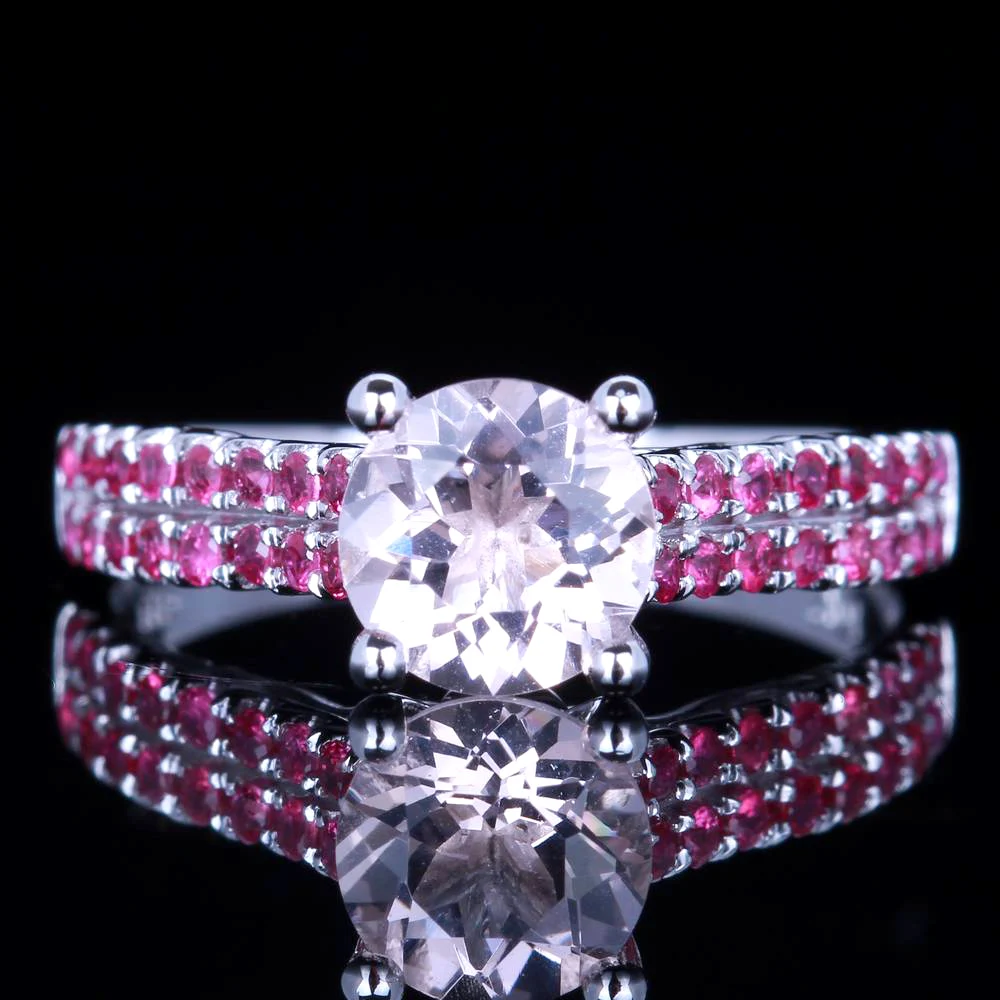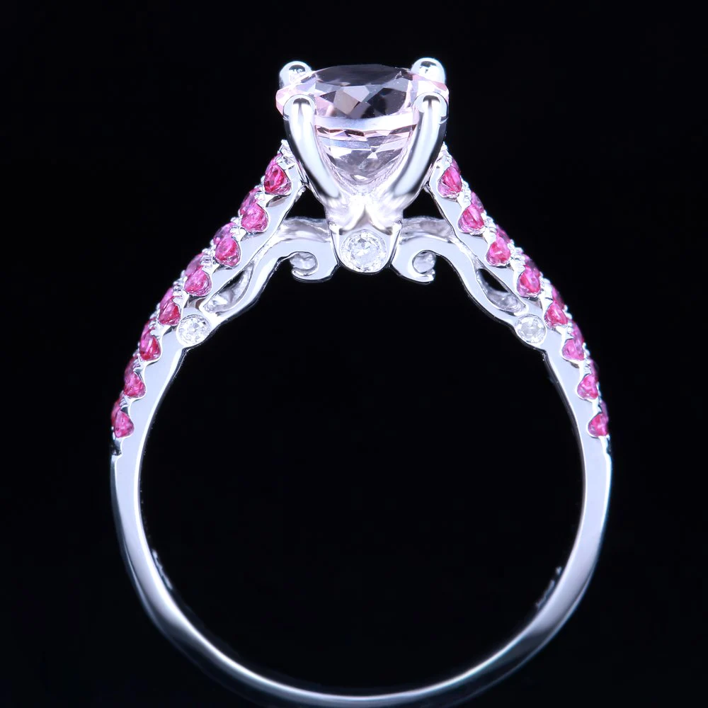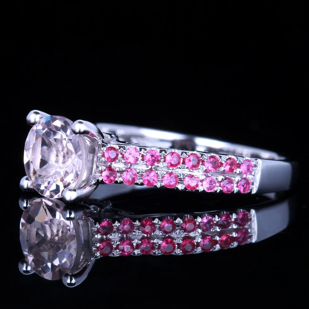 Real 925 Sterling Silver Flawless 6mm Round Morganite Genuine 0.3ct Diamonds & Ruby Engagement Wedding Women Fine Jewelry Ring