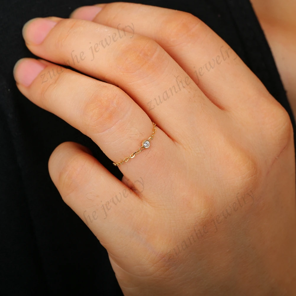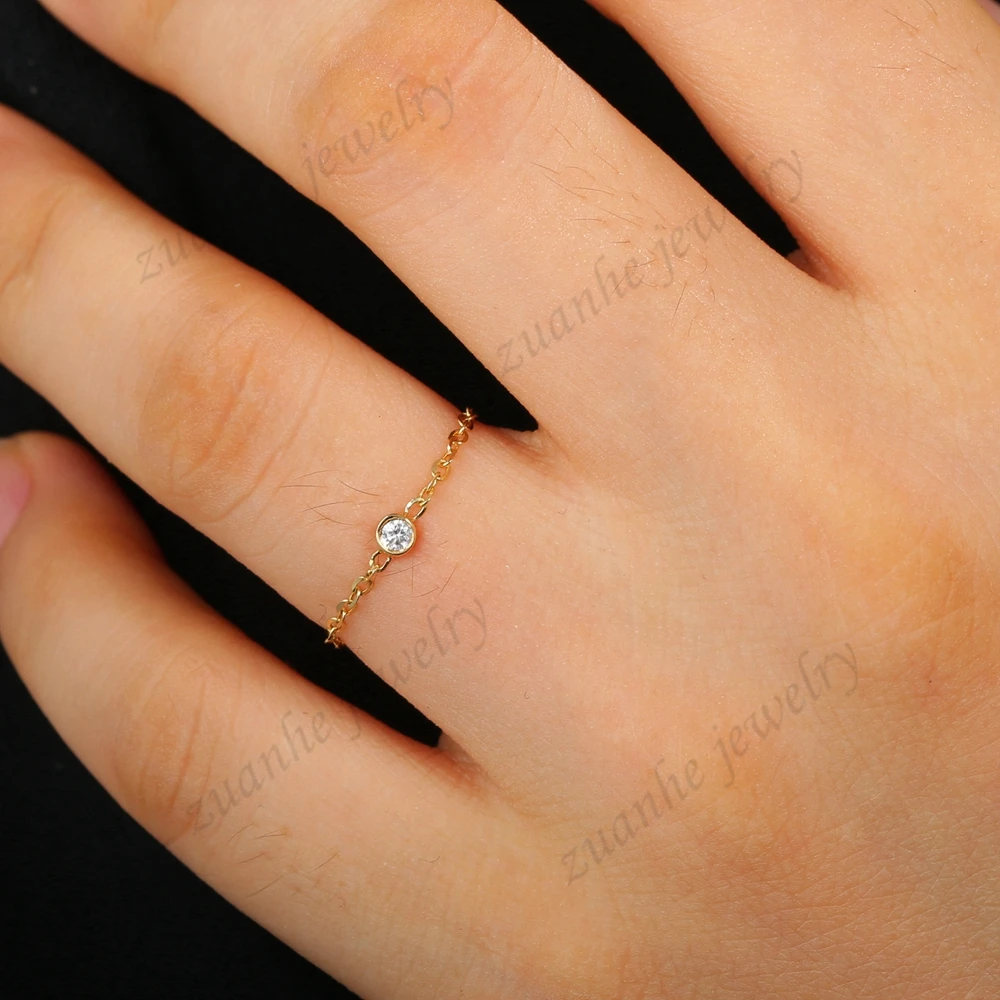 Women Solid 18k Yellow Gold 0.04ct SI/H Full Cut Natural Diamond Engagement Wedding Party Ring Chain Fine Jewelry