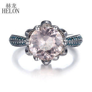 Pave SI/H Blue Diamonds Solid 10K White Gold 8mm Round Pink Morganite Lotus Fine Engagement Ring For Women Fine Jewelry