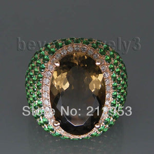 Solid 14kt Rose Gold Natural Smoke Topaz Ring With Emerald and Dia Oval 10x15mm WU032