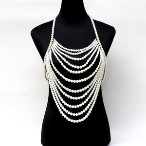 Exaggerated multi layer pearl chain tassel beaded harness necklace halter women sexy wedding bridal body jewelry