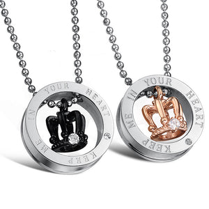 His Queen and Her King Couples Necklace Heart Love Crown Charm Cubic Zirconia Stainless Steel Cube Bar Romantic Gift