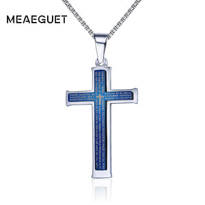 Vintage Blue Layered Catholic Cross Pendant Necklace Men 316L Stainless Steel Jesus Bible Words Necklaces Jewelry