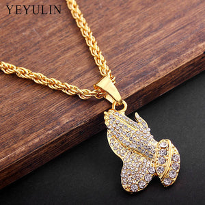 Trendy Alloy Gold Color Fulled Crystal Double Hands Prayer Pendant Necklace Hop Link Chain Necklace For Men