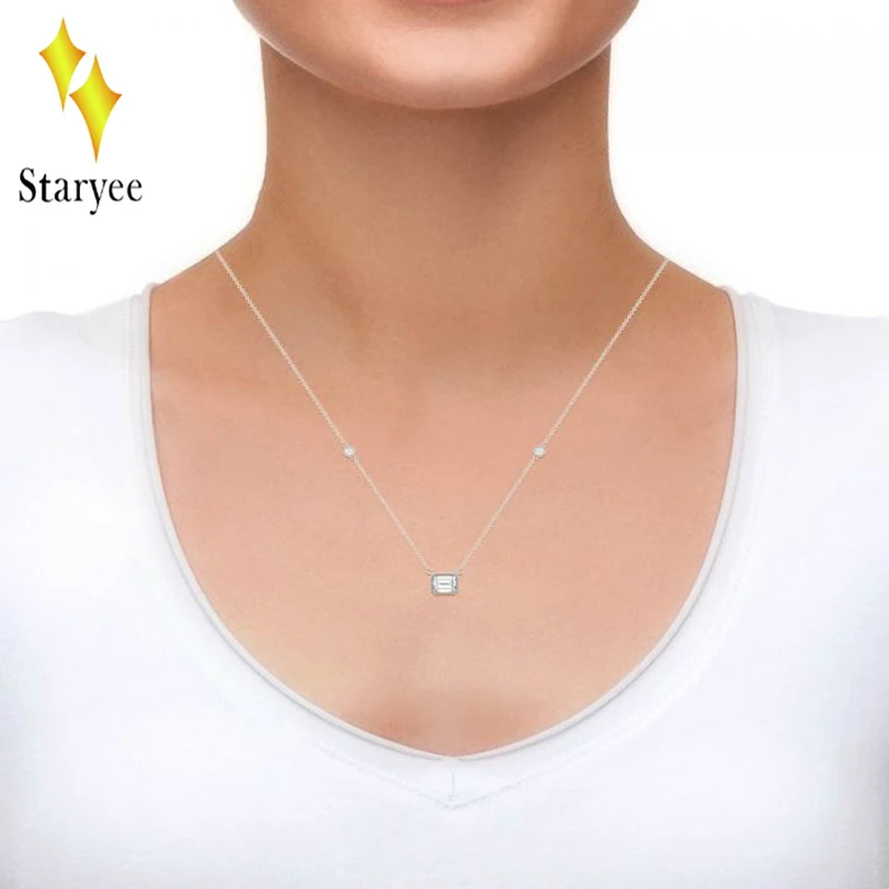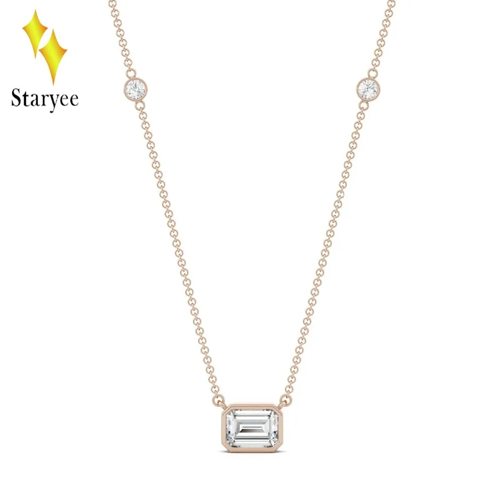 Moissanite Necklace 1.05CTW Emerald Cut Moissanite East-West Solitaire with Side Accents Lab Diamond Necklace 18K White Gold