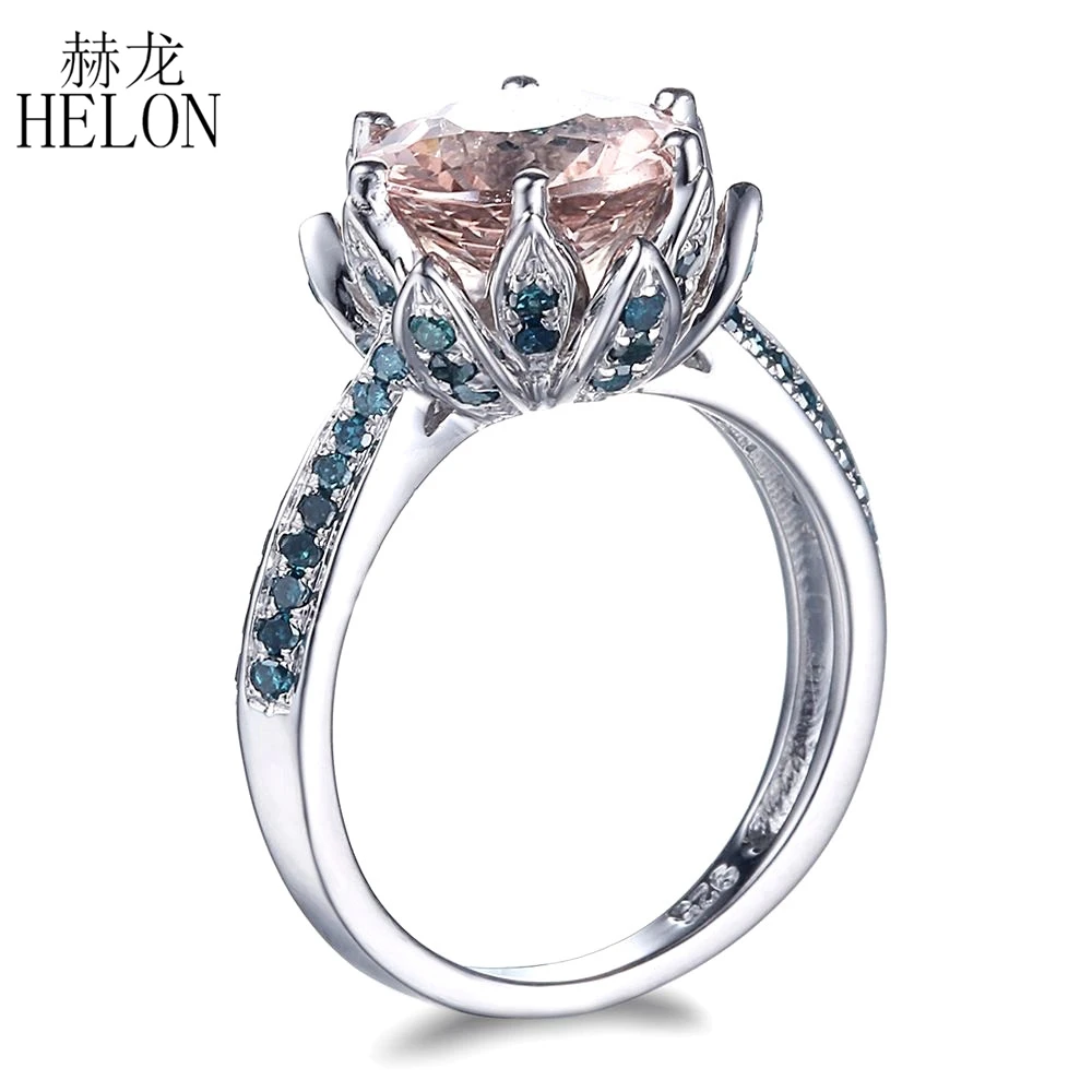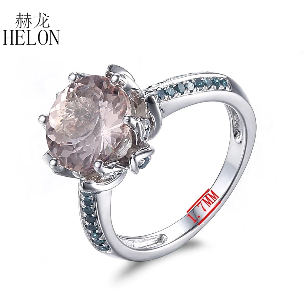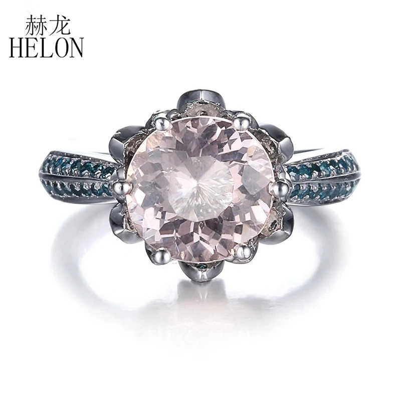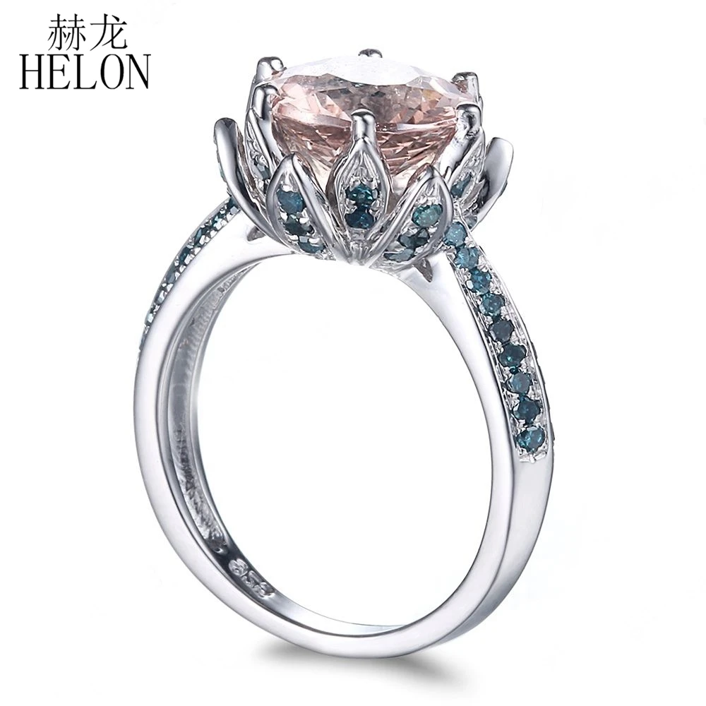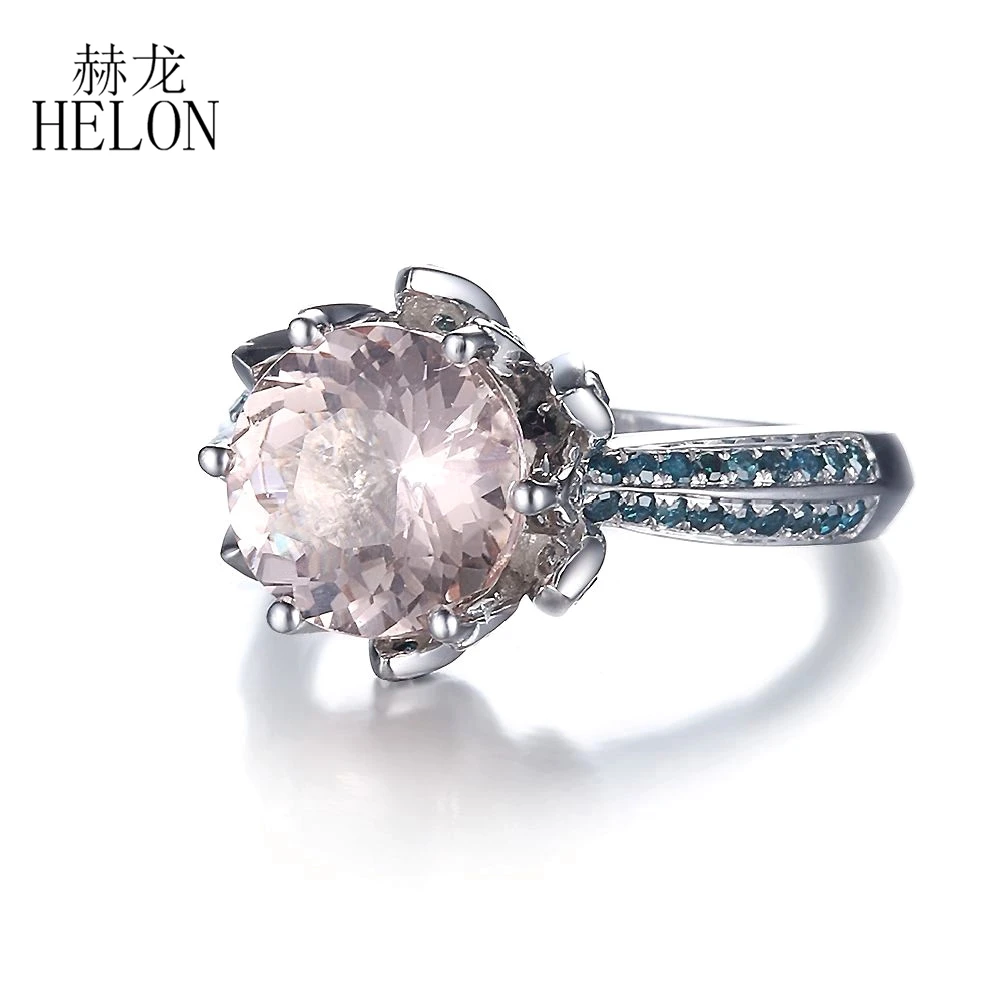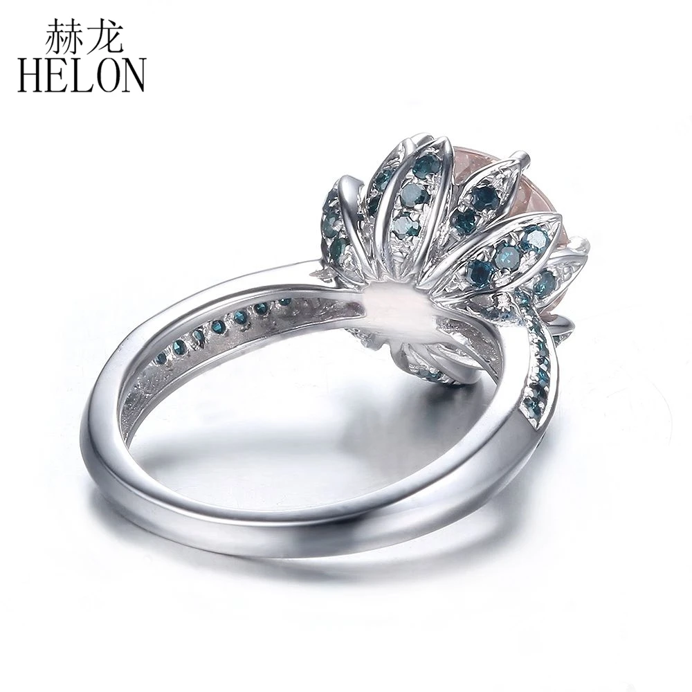 Pave SI/H Blue Diamonds Solid 10K White Gold 8mm Round Pink Morganite Lotus Fine Engagement Ring For Women Fine Jewelry