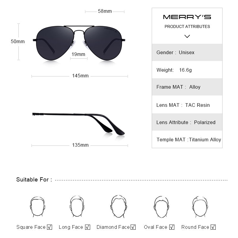 MERRYS DESIGN Men/Women Classic Pilot HD Polarized Sunglasses Aviation Frame Titanium Memory Alloy Temple UV400 Protection S8153