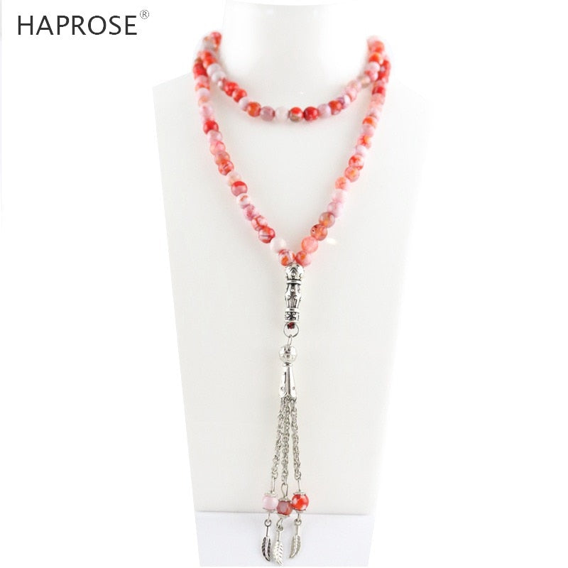 100% Natural agate Prayer Islamic Muslim tasbih Allah Rosary blue textured agate bracelets 99 beads 6-10mm red tassel necklace