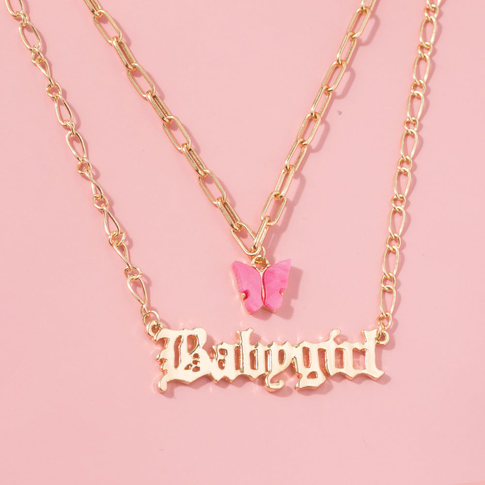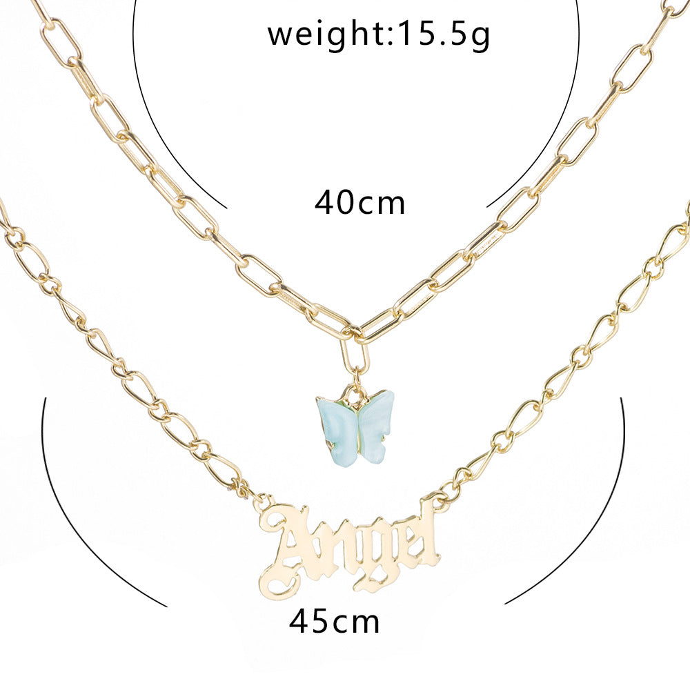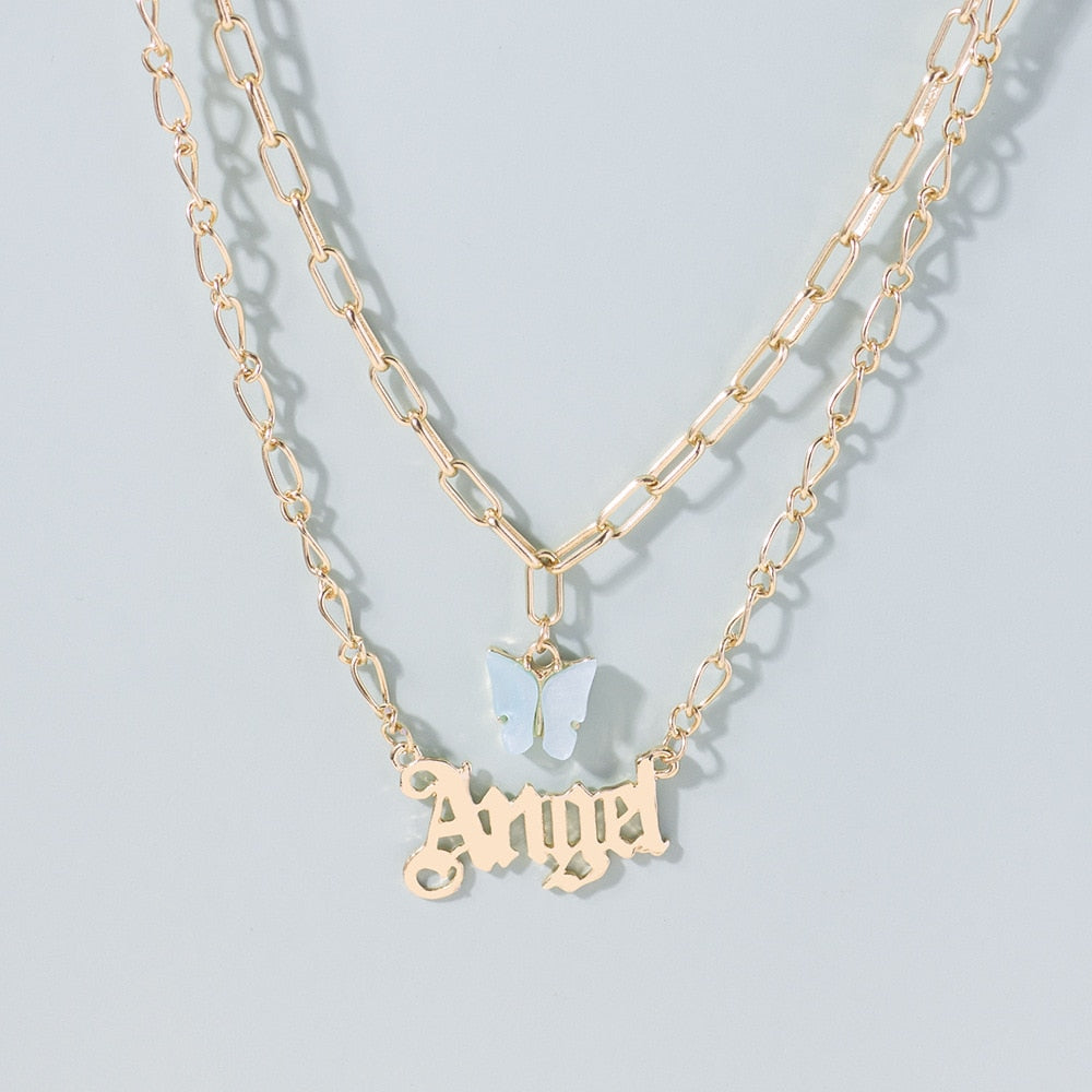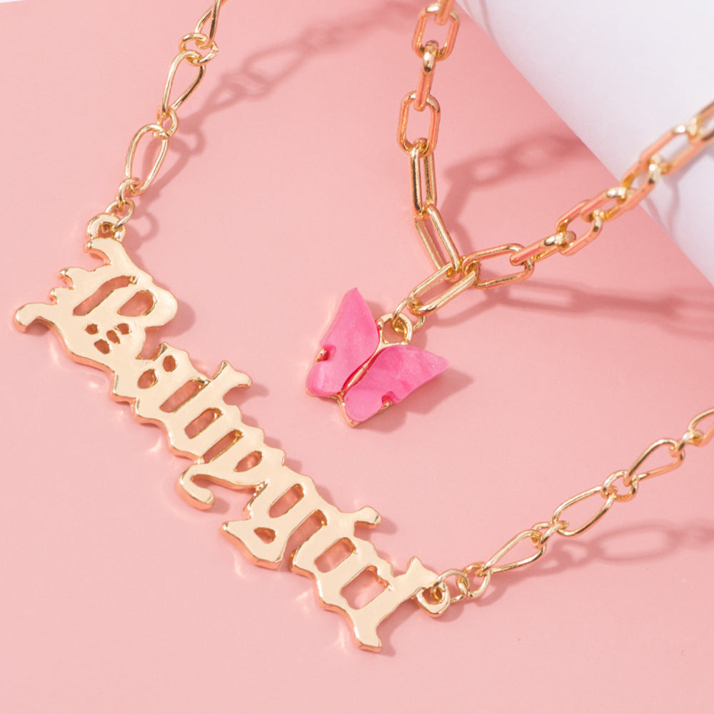 Moda farfalla acrilica Old English Font pendenti Collana doppio strato acido acetico Collana per bambina Girocollo Gioielli di dichiarazione