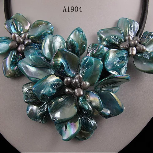 Collana fatta a mano in pelle con fiori di conchiglia, vera pelle blu con fiori di conchiglia di perle genuine, gioielli perfetti per le donne