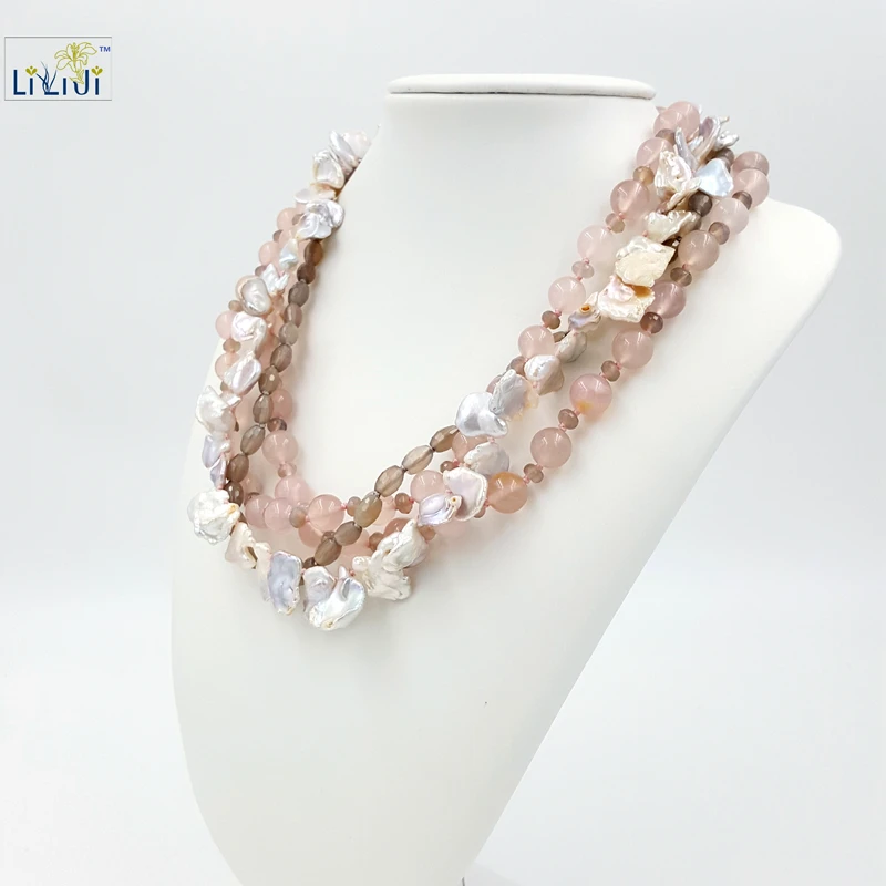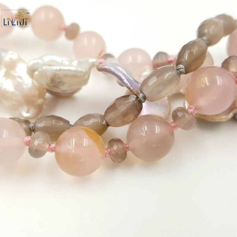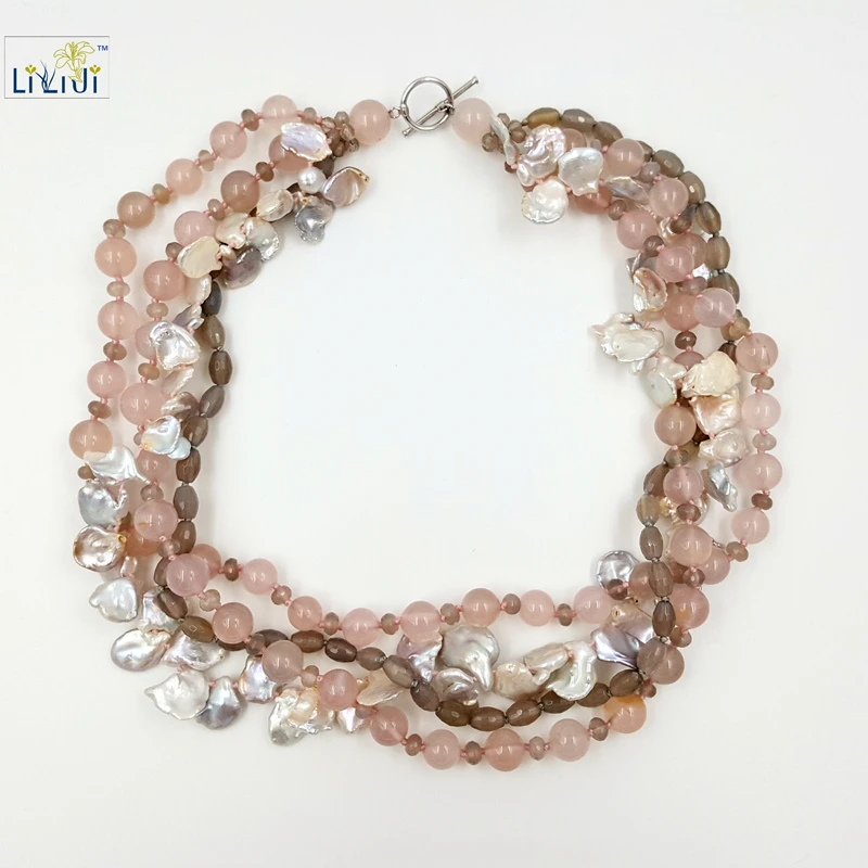 Natural Chalcedony , Keshi Pearl ,Grey Agate 4 Strands with 925 sterling silver Clasp Fashion Women Jewelry Necklace