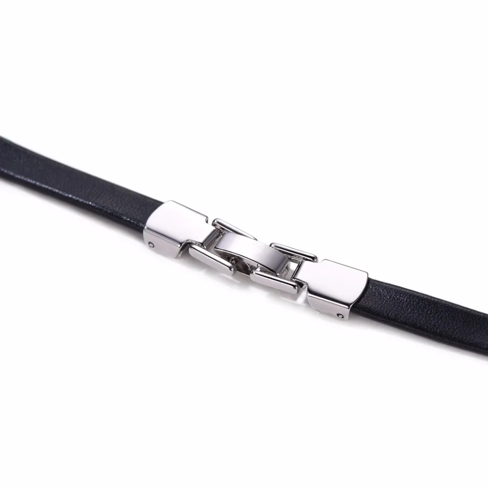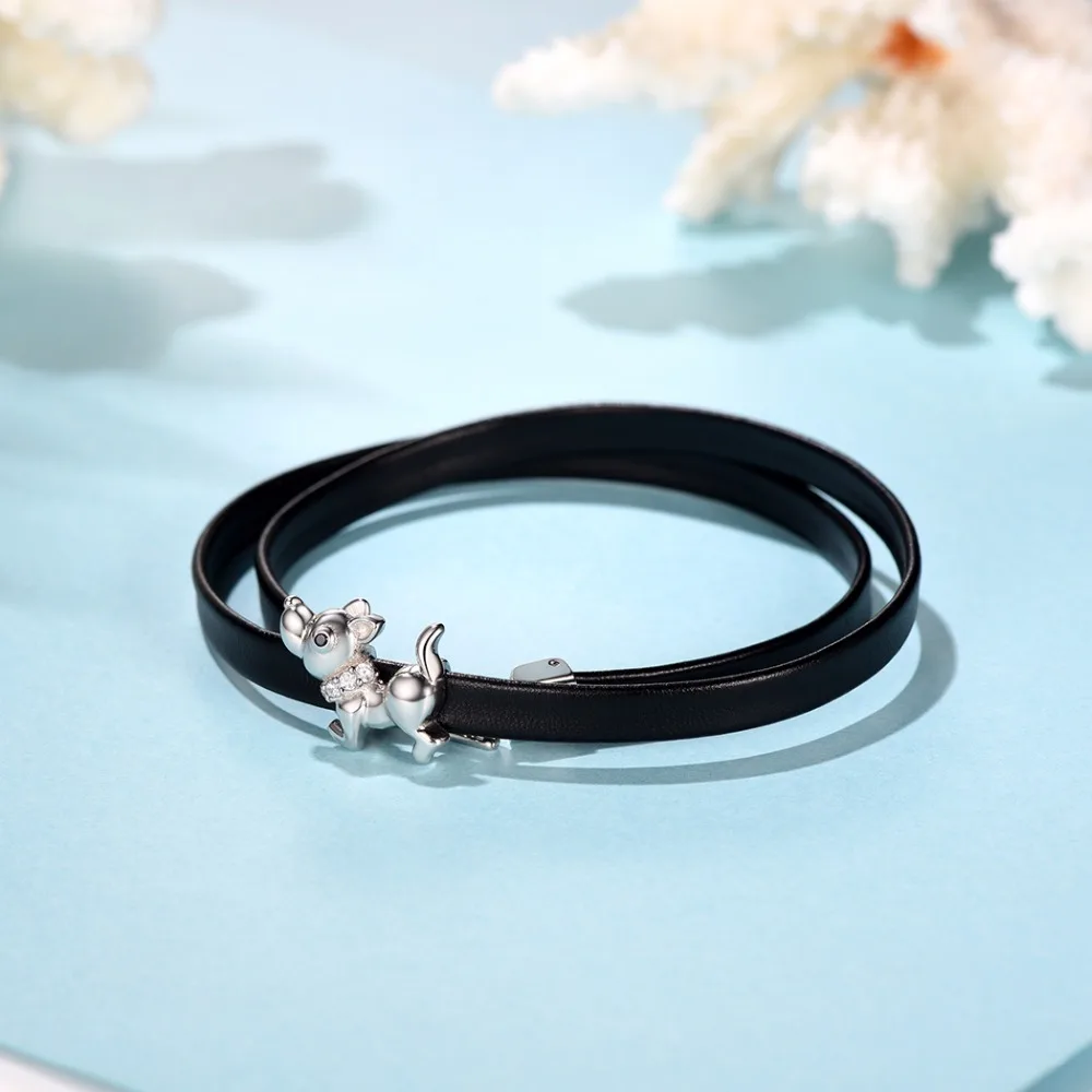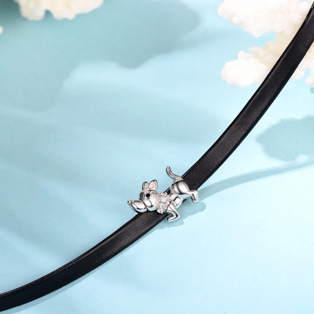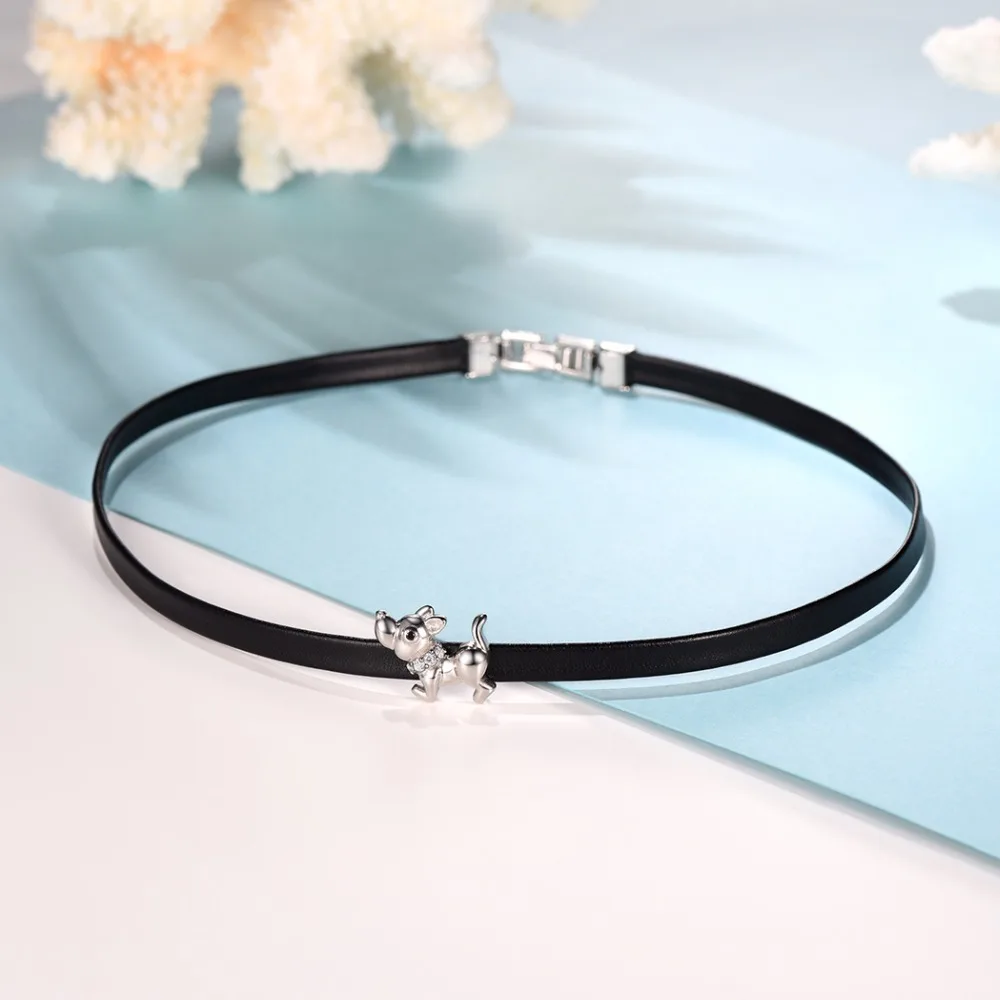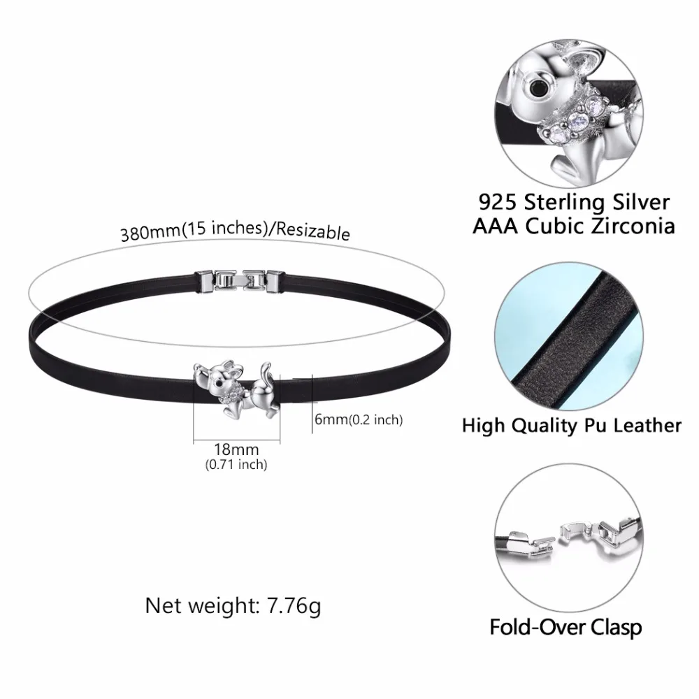 Black Genuine Leather Choker Necklace For Women & Adorable Charm Dog 925 Sterling Silver Animal Fine Jewelry SCN6264B