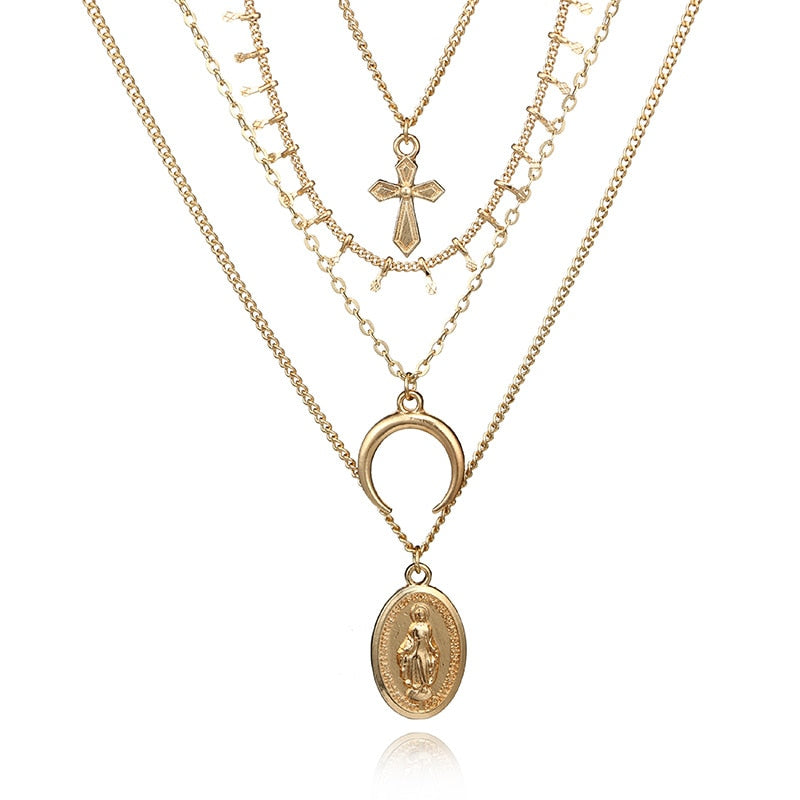 Multilayer Crystal Rose Pendant Necklace Women Gold Moon Star Horn Crescent Choker Necklaces Jewelry