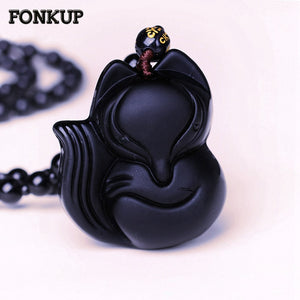 Men Long Necklace Women Hyperbole Jewellery Fox Pendant Obsidian Bead Chain Accessories Simple Prayer Gioielli Original
