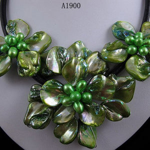 Collana fatta a mano in pelle con fiori di conchiglia, vera pelle verde con fiori di conchiglia, gioielli perfetti per le donne