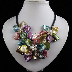 Collana fatta a mano in pelle con fiori di conchiglia, vera pelle multicolore con fiori di conchiglia di perle genuine, gioielli perfetti per le donne