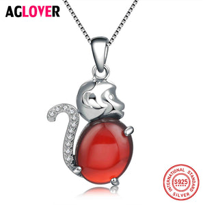 Real Pure 925 Sterling Silver Statement Cute 3D Red Crystal Zircon Monkey Necklaces & Pendants For Kids Birthd Gift