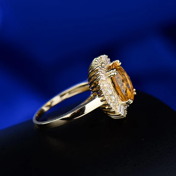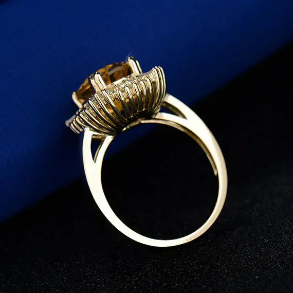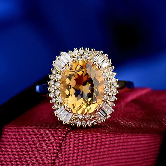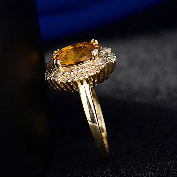 Anello ovale 9x11mm in oro giallo 14kt con diamante giallo citrino naturale, anello con diamante baguette per donna SR0002