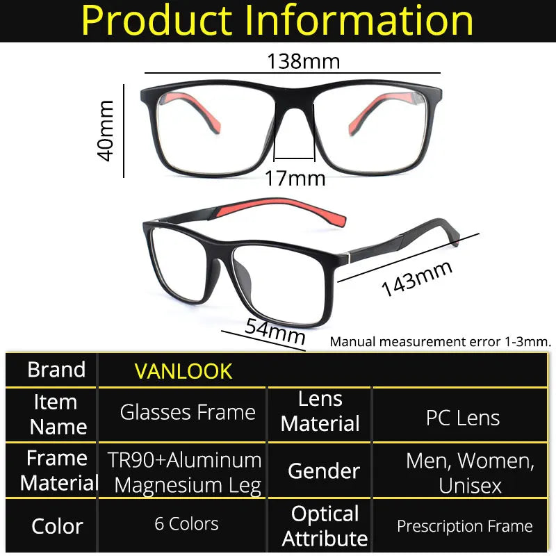 Model Number : Transparent Glasses Frames Pattern Type : Solid Gender : WOMEN Frame Material : Plastic Titanium Brand Name : VANLOOK Origin : Mainland China Eyewear Accessories : FRAMES Item Type : Eyewear Accessories Certification : NONE Item Name : Fashion Sport Glasses Frames Frame Materials : TR90 +Aluminum Magnesium Lens Materials : Plastic Gender : Women, Men, Unisex Fashion Frame Colors 1 : Glossy Black Red, Glossy Black Grey,Black Blue Fashion Frame Colors 2 : Matt Black Red, Matt Black Grey, Wine Red