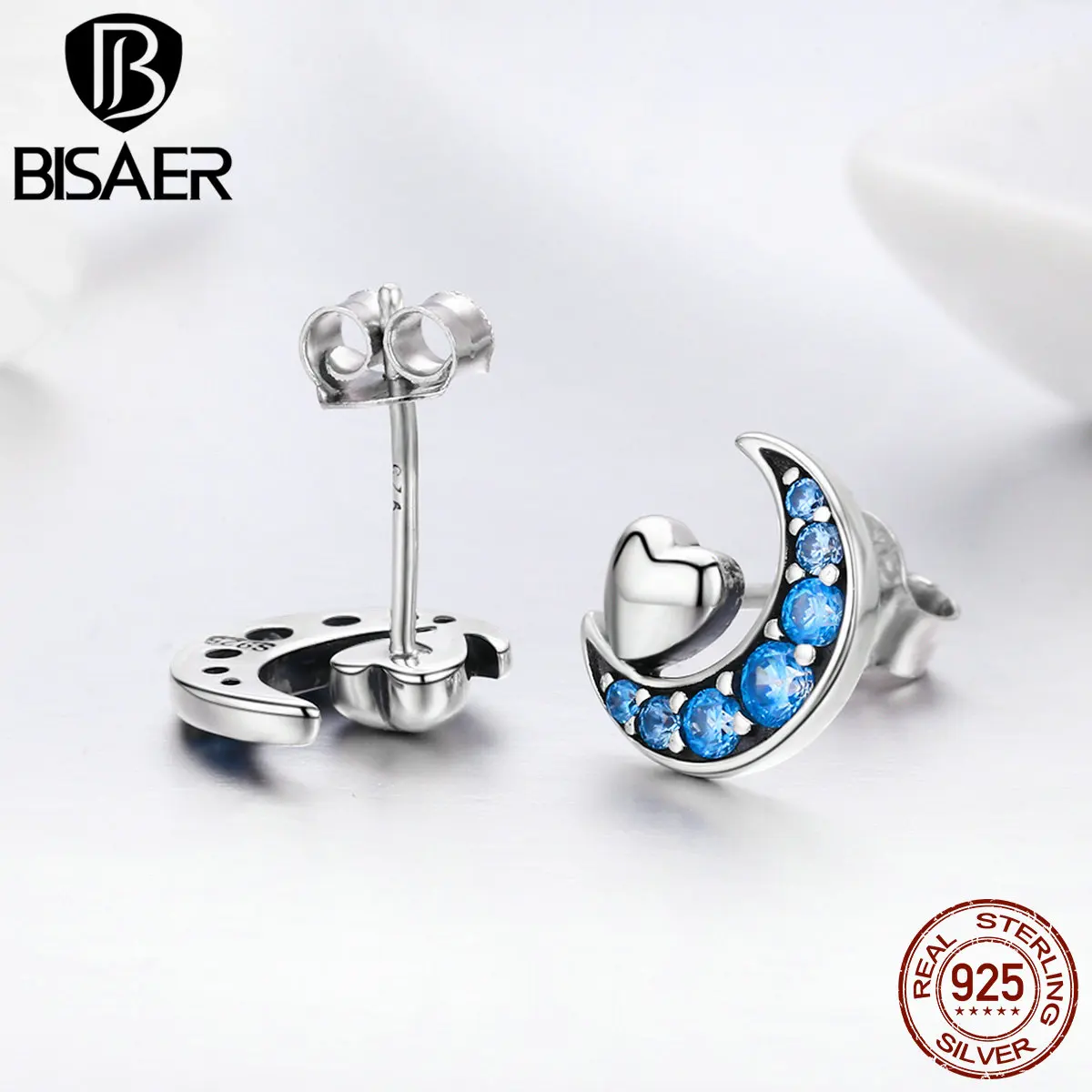 100% 925 Sterling Silver Blue CZ I Love You To The Moon Heart Stud Earrings Women Girl Sterling Silver Jewelry Birthd Gift