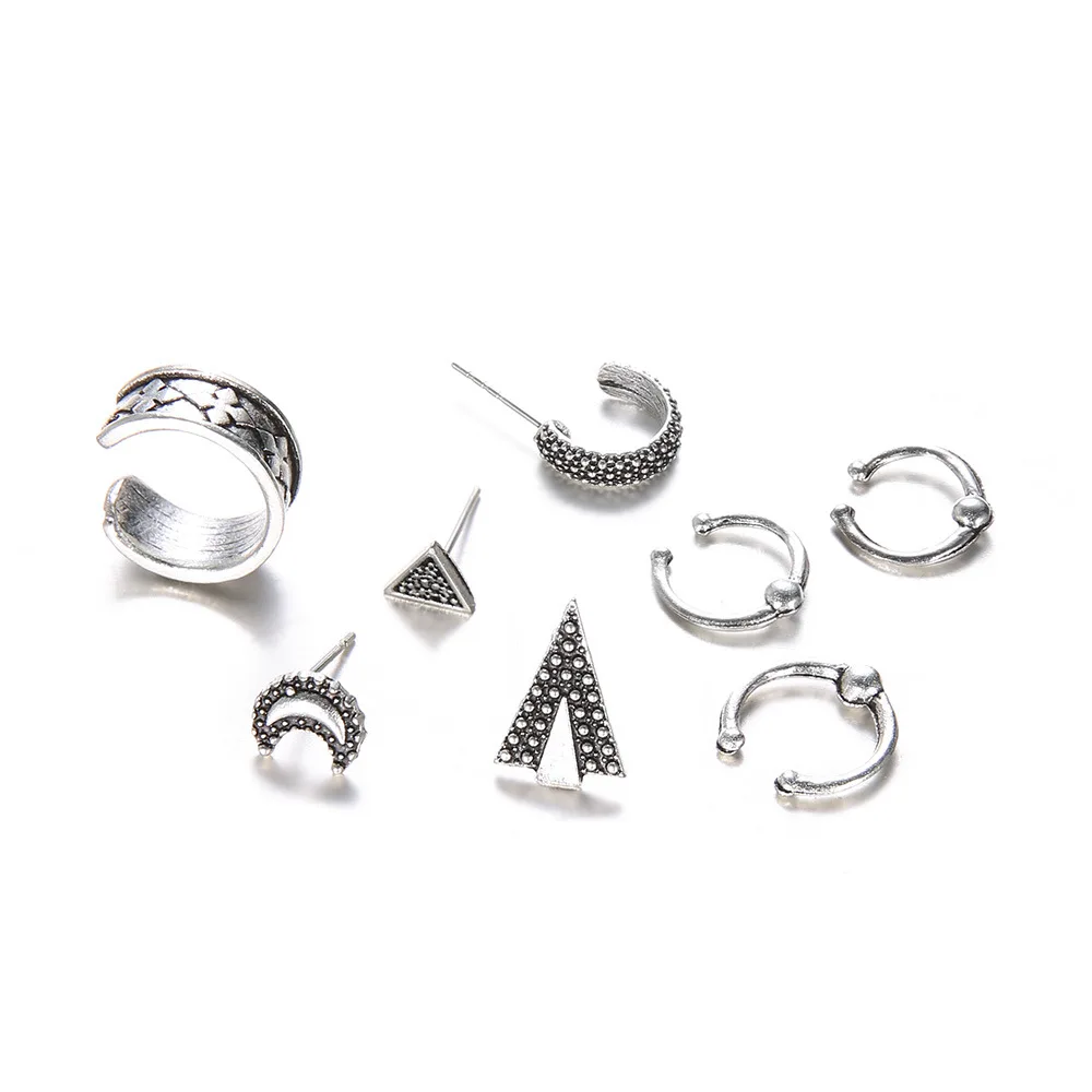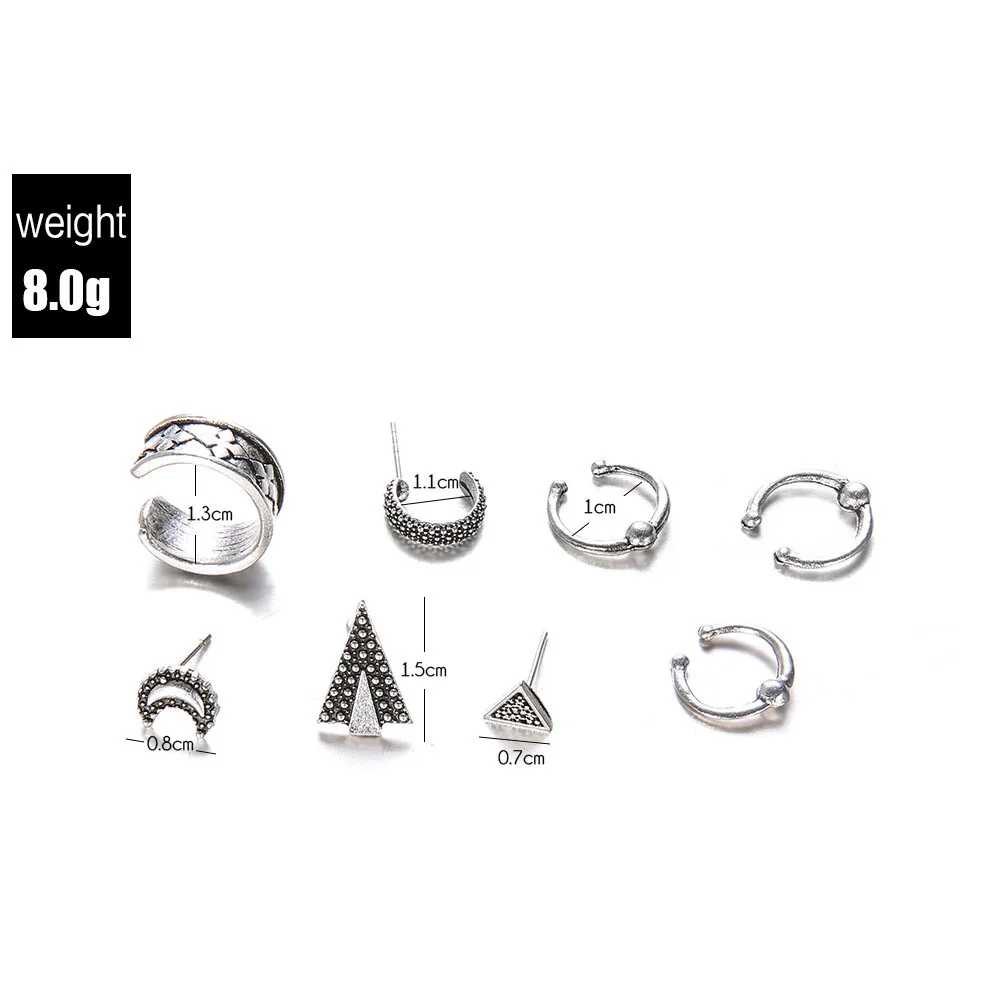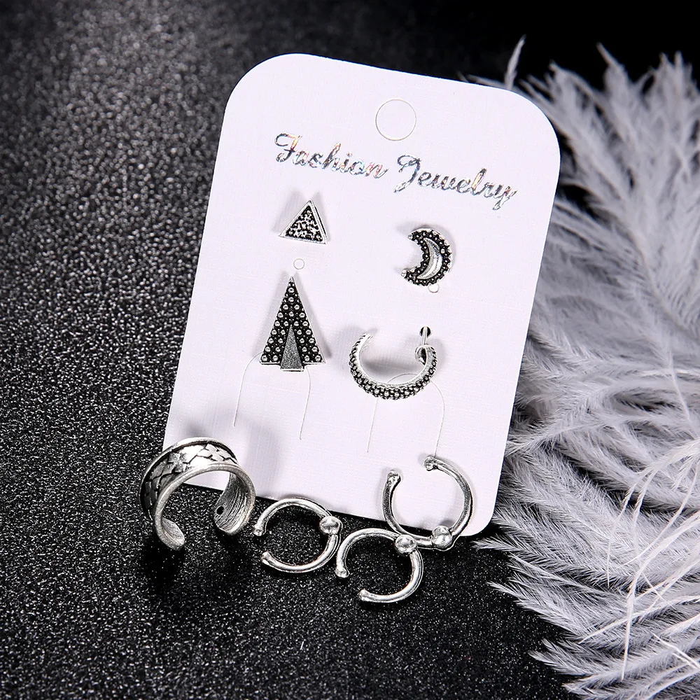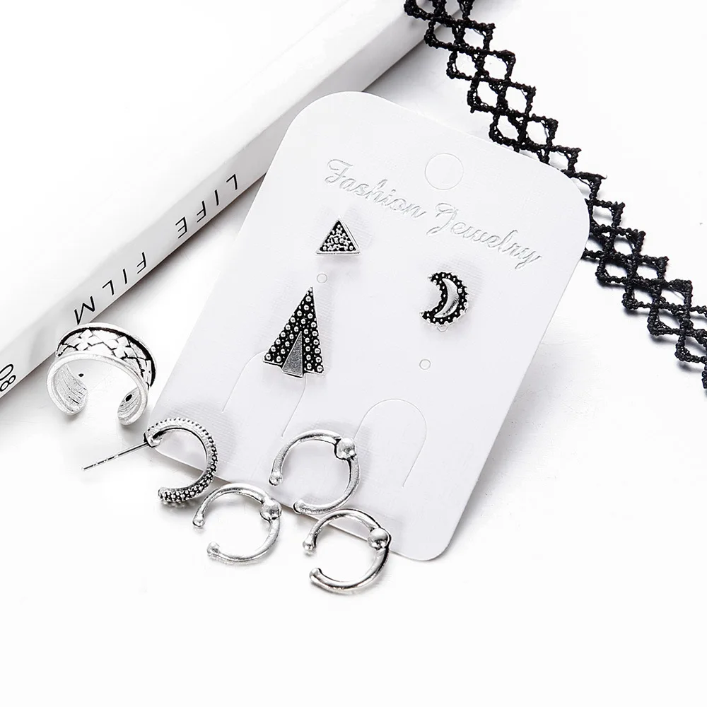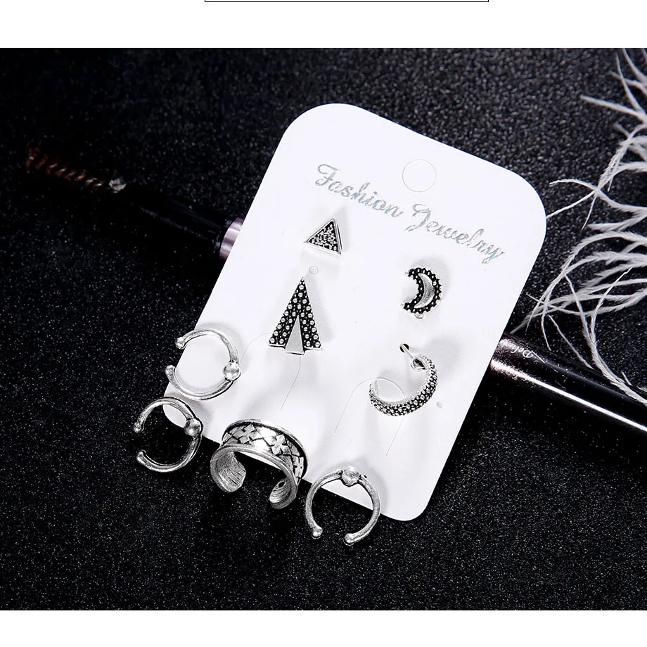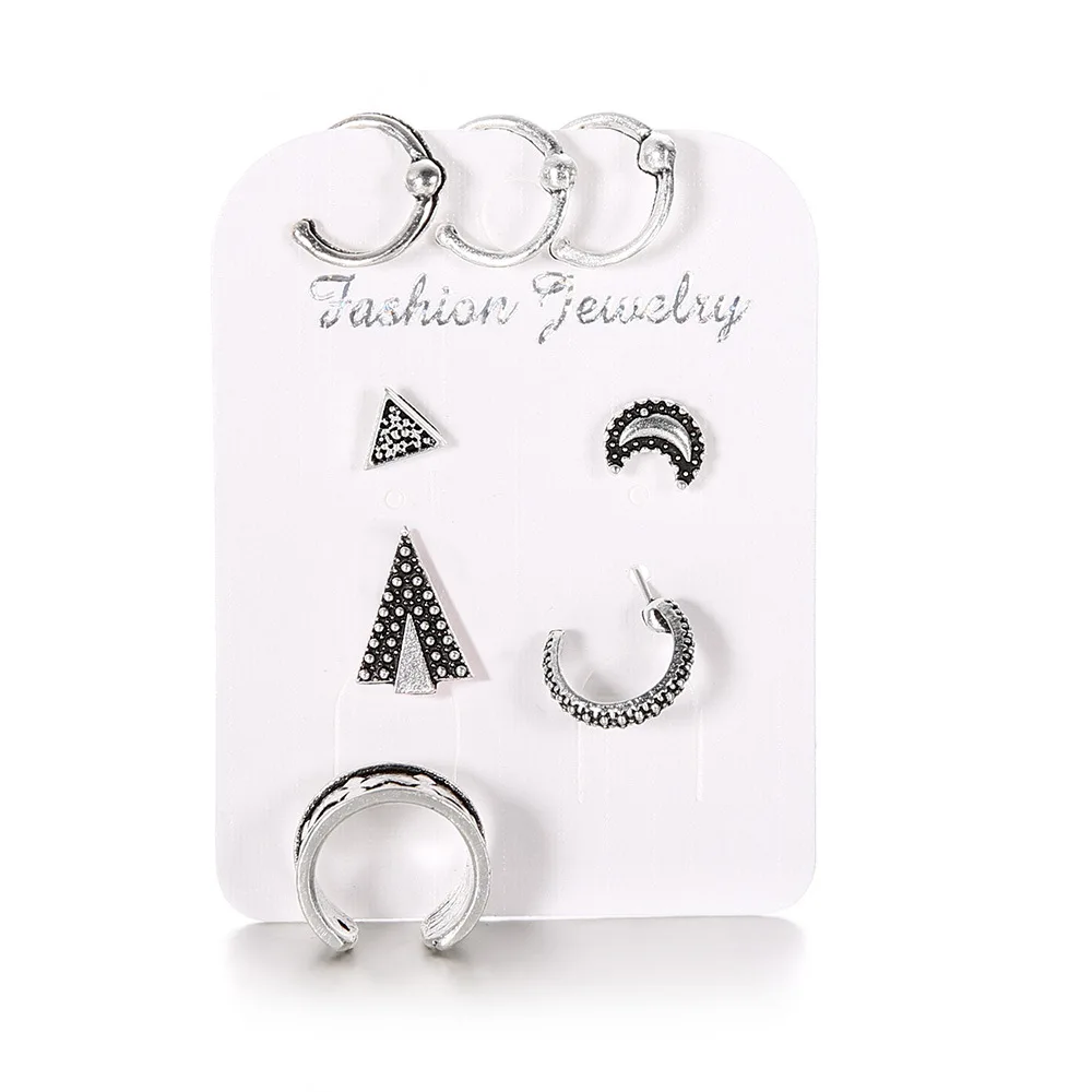12 Sets/Lot Stud Earrings For Women Moon Crescent Totem Ear Clip Stud Earring Geometric Arrow Antique Silver Color Jewelry Gifts