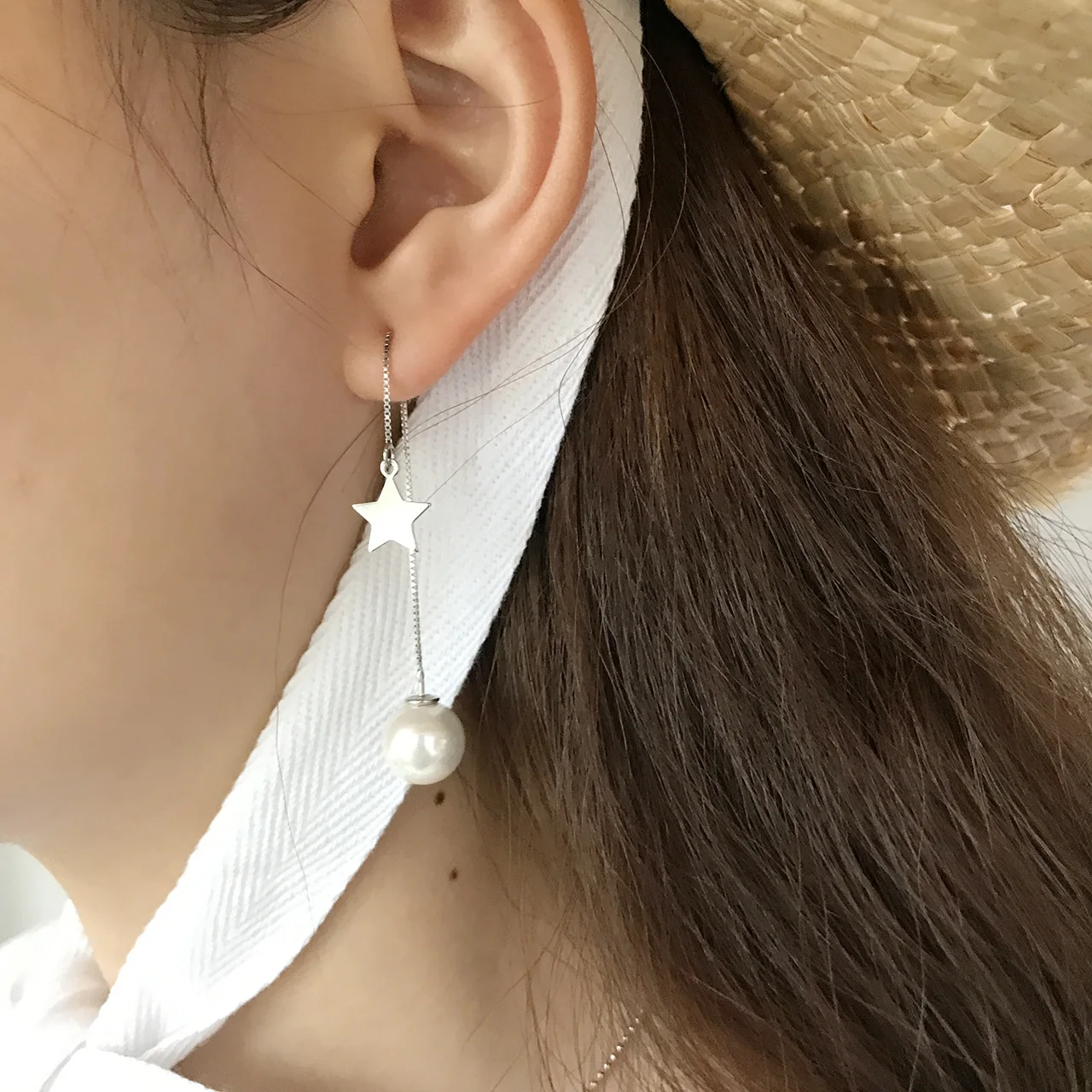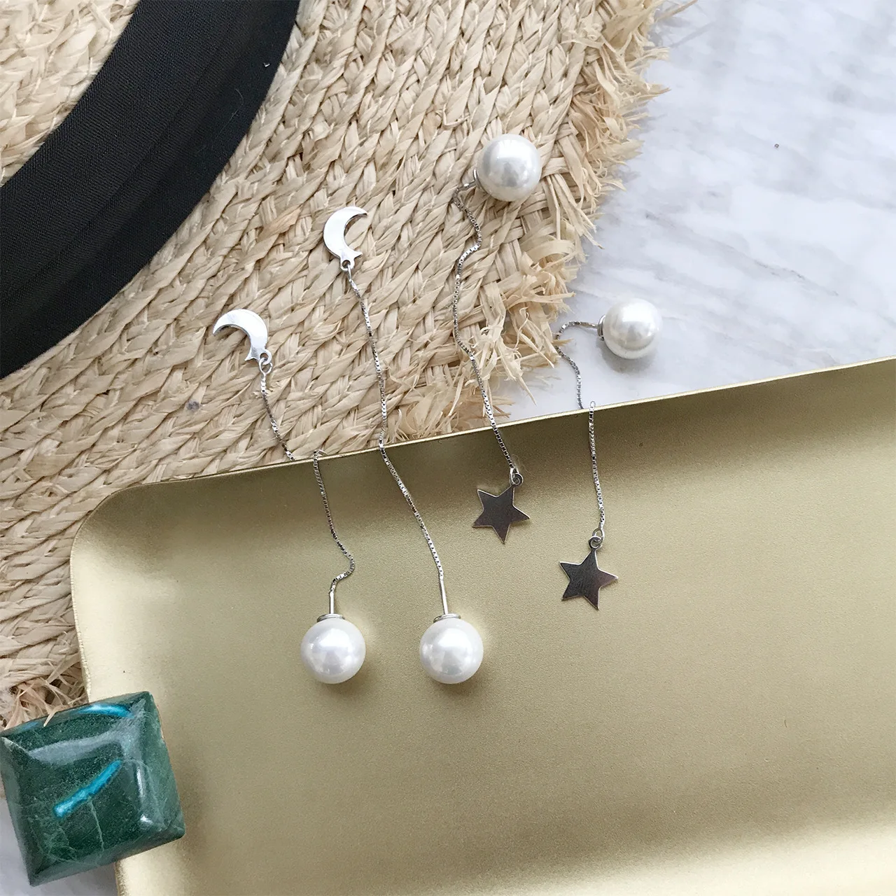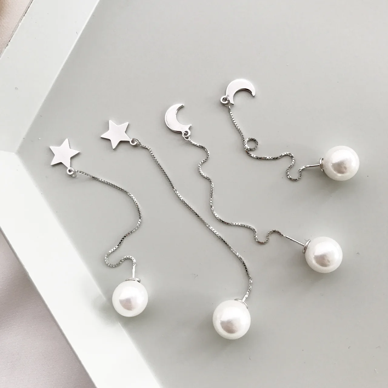 2018 Fashion 925 sterling silver pearl stars the moon Real line long ears sweet chain pendant earrings