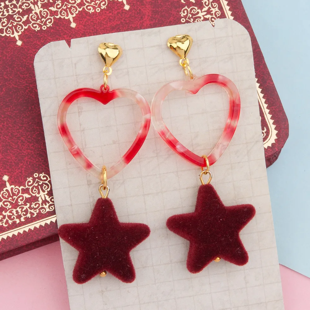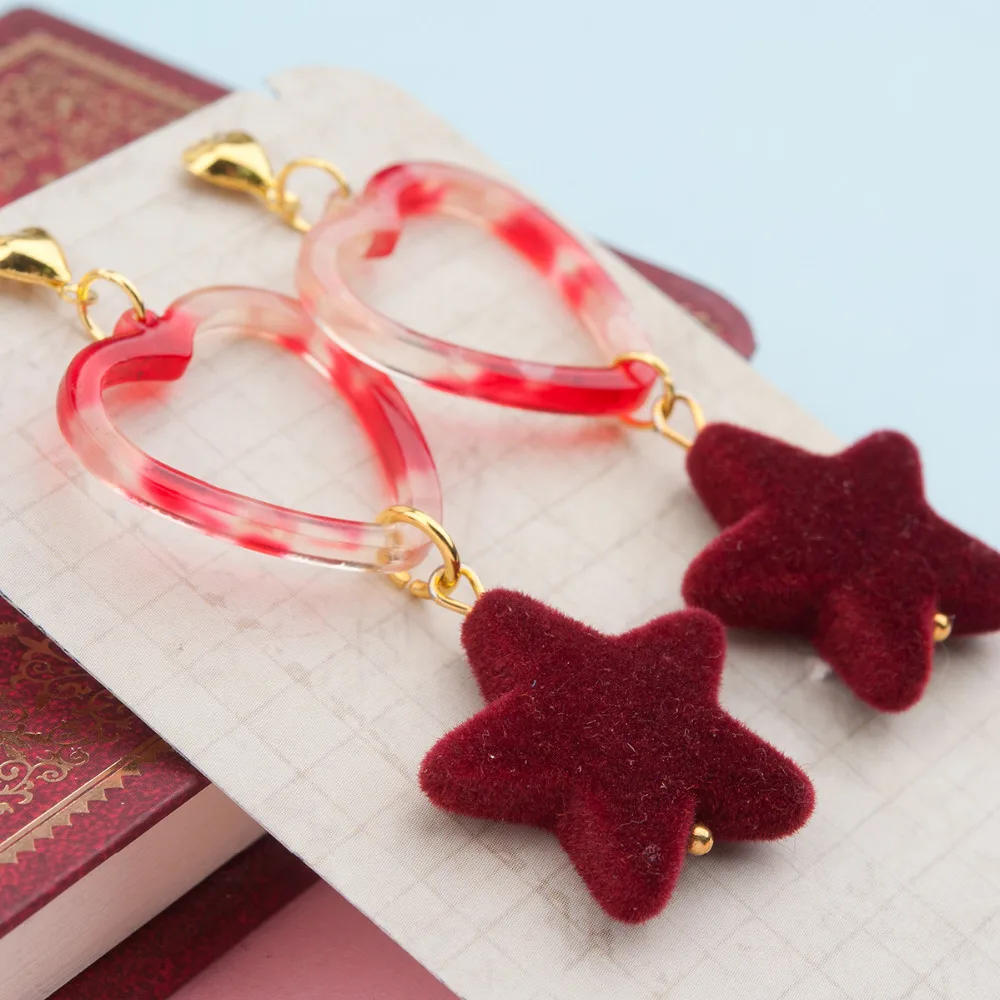 Handmade Ear Stud Earrings Gold Color Red Heart Star Acrylic Velvet Beads Pendant For Women Hyperbole 6.3x2.4cm, 1 Pair
