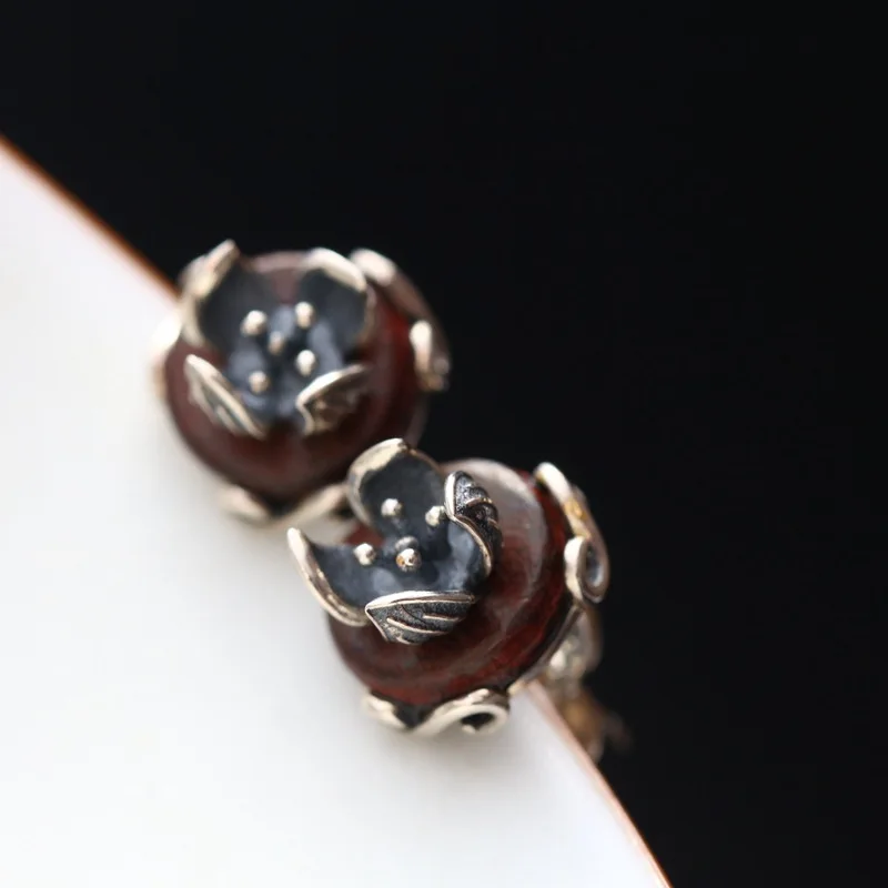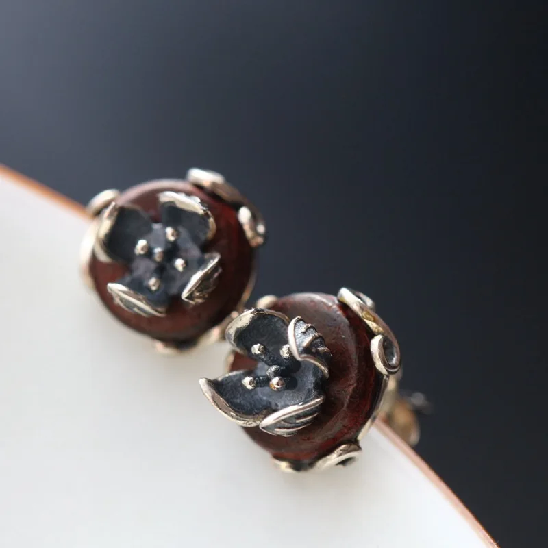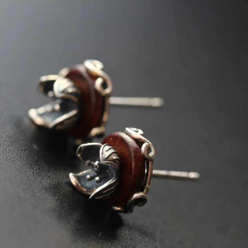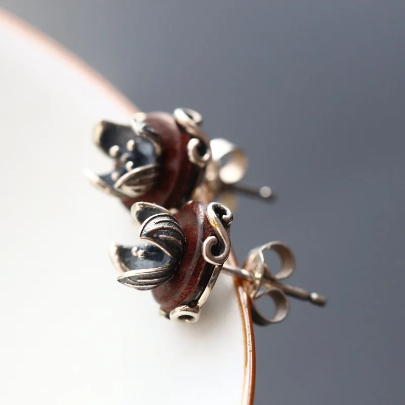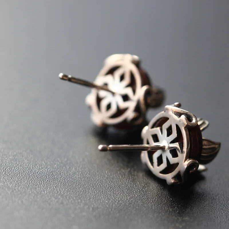 925 sterling silver earrings hand Thai silver restoring ancient ways with natural red sandalwood stud earrings