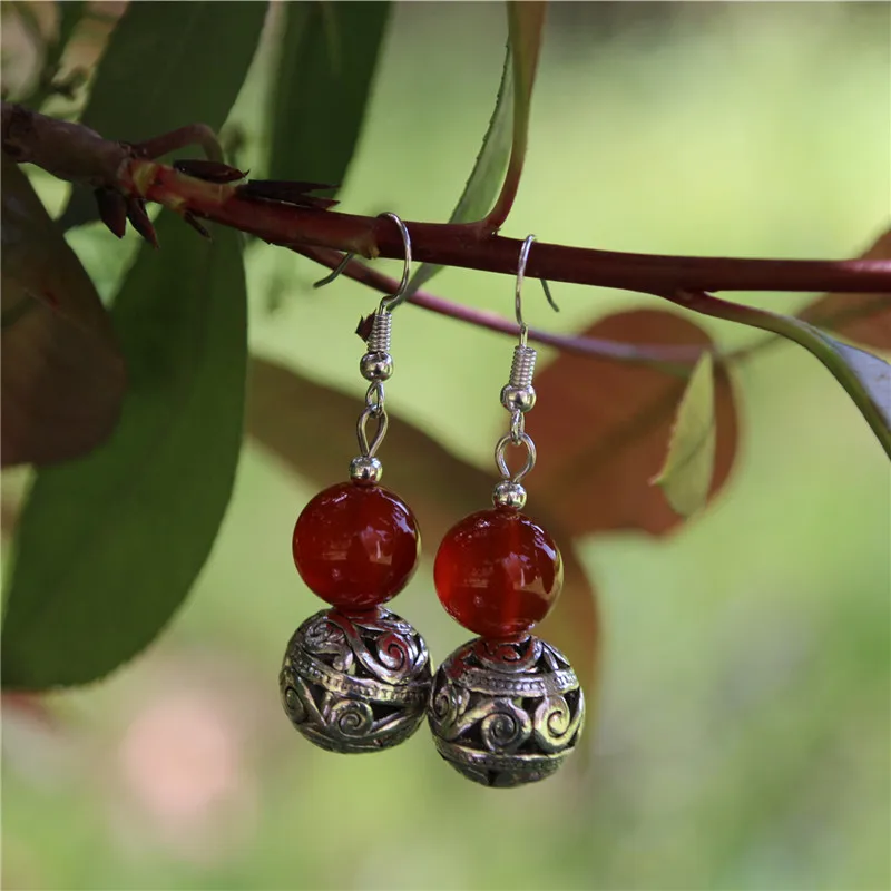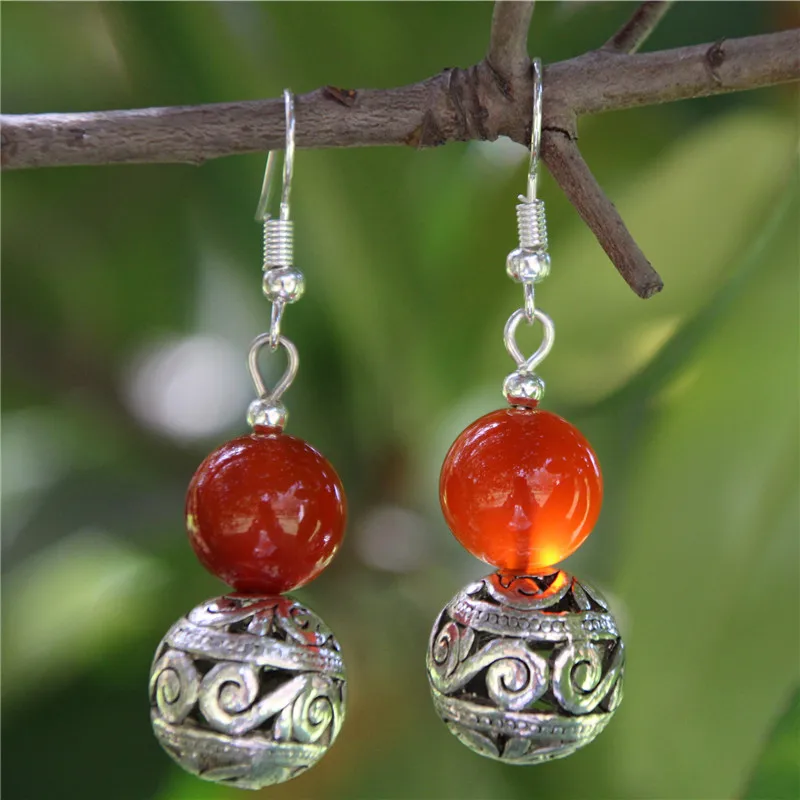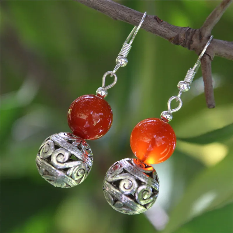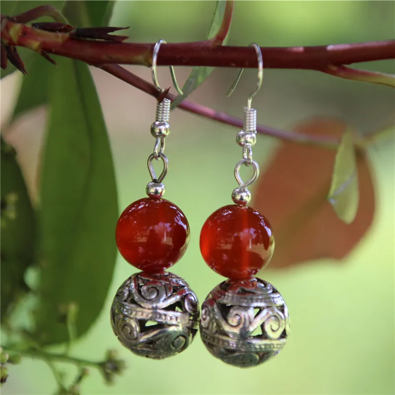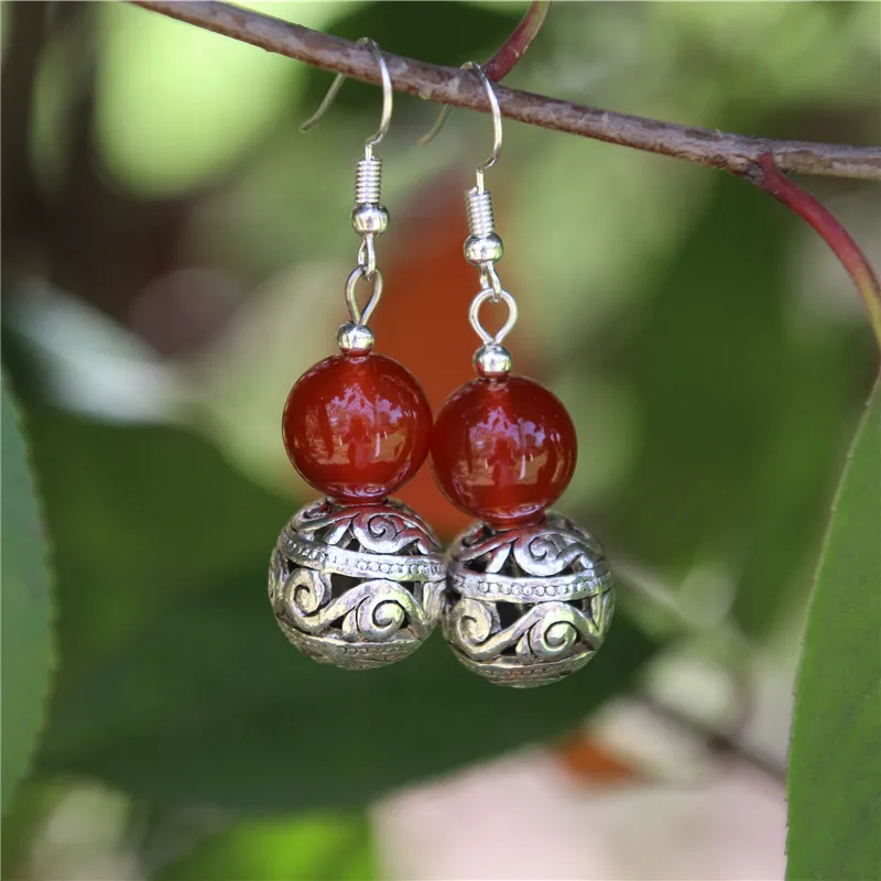 Chinese Style Handmade Jewelry Female Tibetan Silver Earring Ball Hollow Craft High Quality Red Chalcedony Original Design