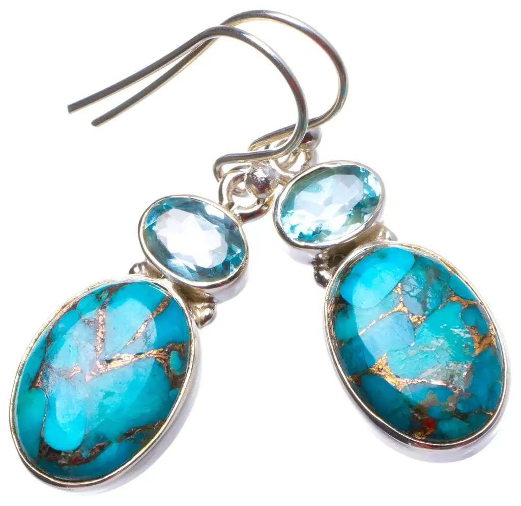 Natural Turquoise and Blue Topaz Handmade Unique 925 Sterling Silver Earrings 1.25 X3623