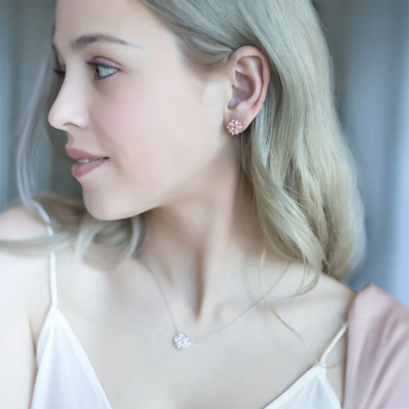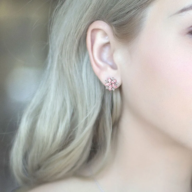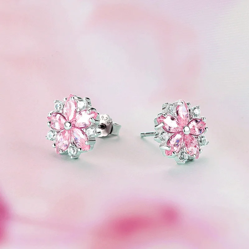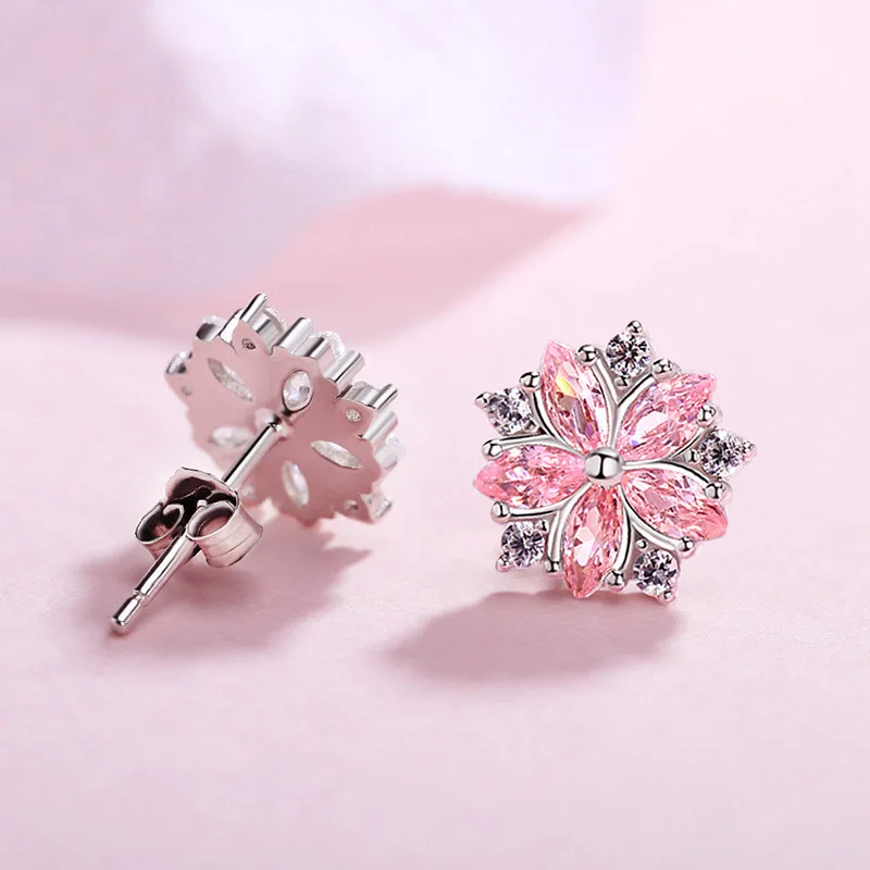 New Hot Pink Cubic Zirconia Sakura Flowers Cherry Blossoms Stud Earrings For Women Girl Romantic Ear Jewelry
