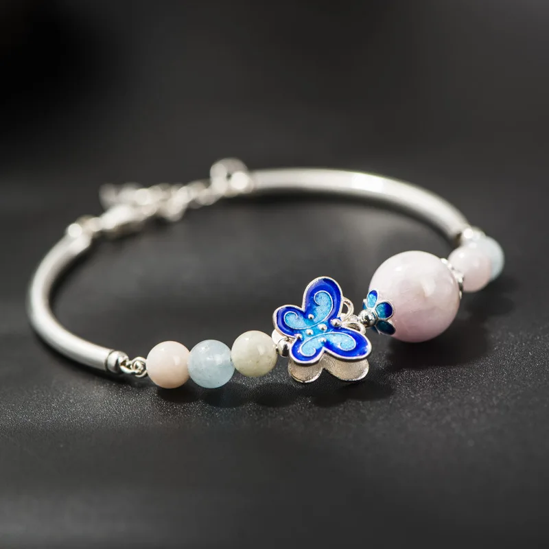 Silver Beads Bracelet 925 Sterling Silver Jewelry Hand-set Natural Morganite Blue Butterfly Bracelet