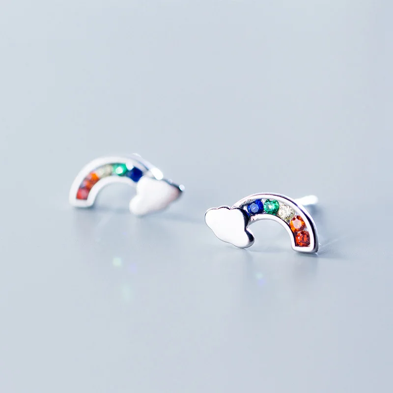 100% 925 Solid Real Sterling Silver Jewelry 5mmX12mm Rainbow with CZ Stud Earring For Teen Girl Friend Kid Lady XY1029